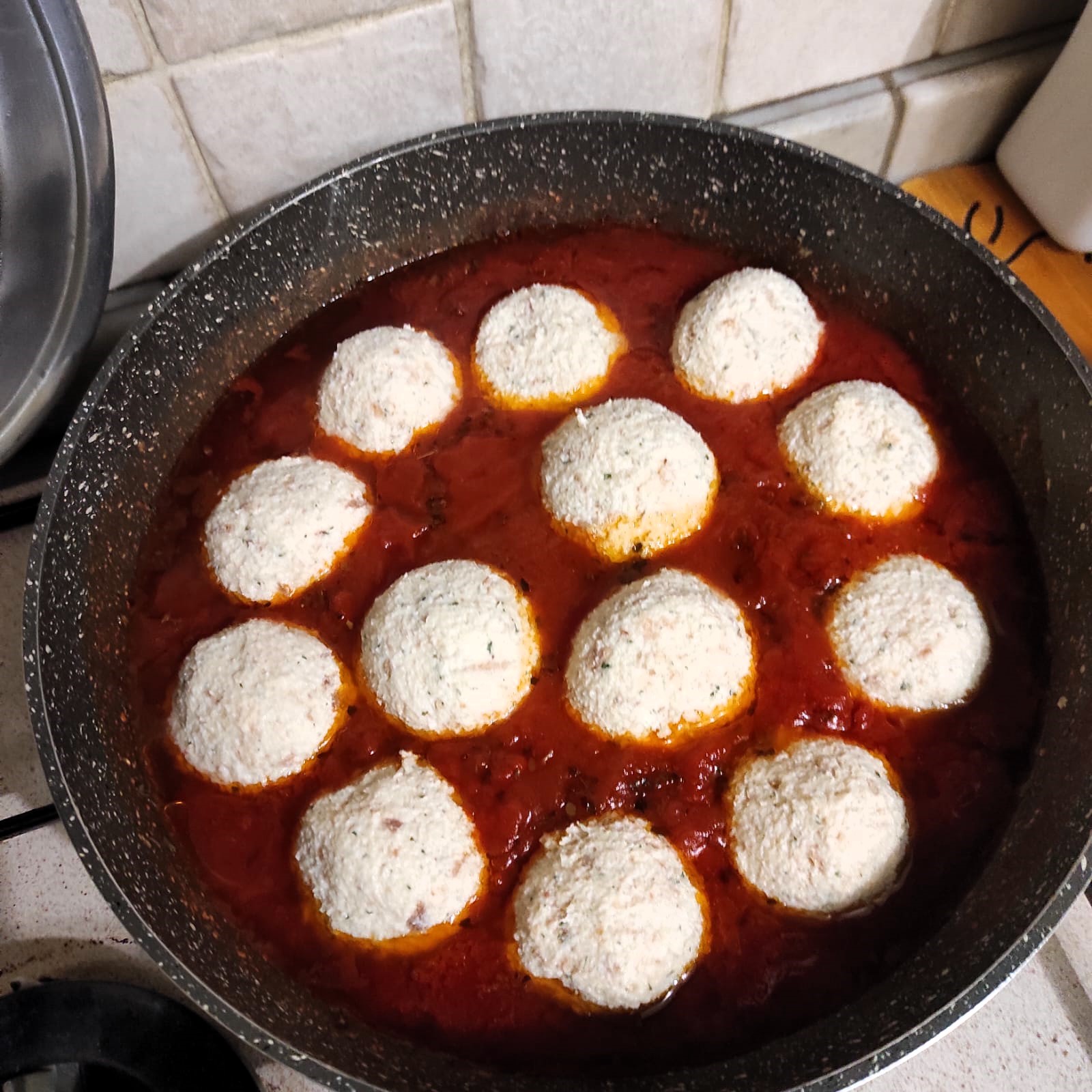 Trascorso il tempo di riposo, riprendete le polpette dal frigo. Trasferitele con delicatezza nel sugo caldo, una accanto all’altra. Lasciatele cuocere a fiamma medio-bassa per circa 20-25 minuti. Giratele a metà cottura, ma fatelo con estrema delicatezza per non romperle. Saranno pronte quando il sugo si sarà addensato e le polpette saranno ben cotte.