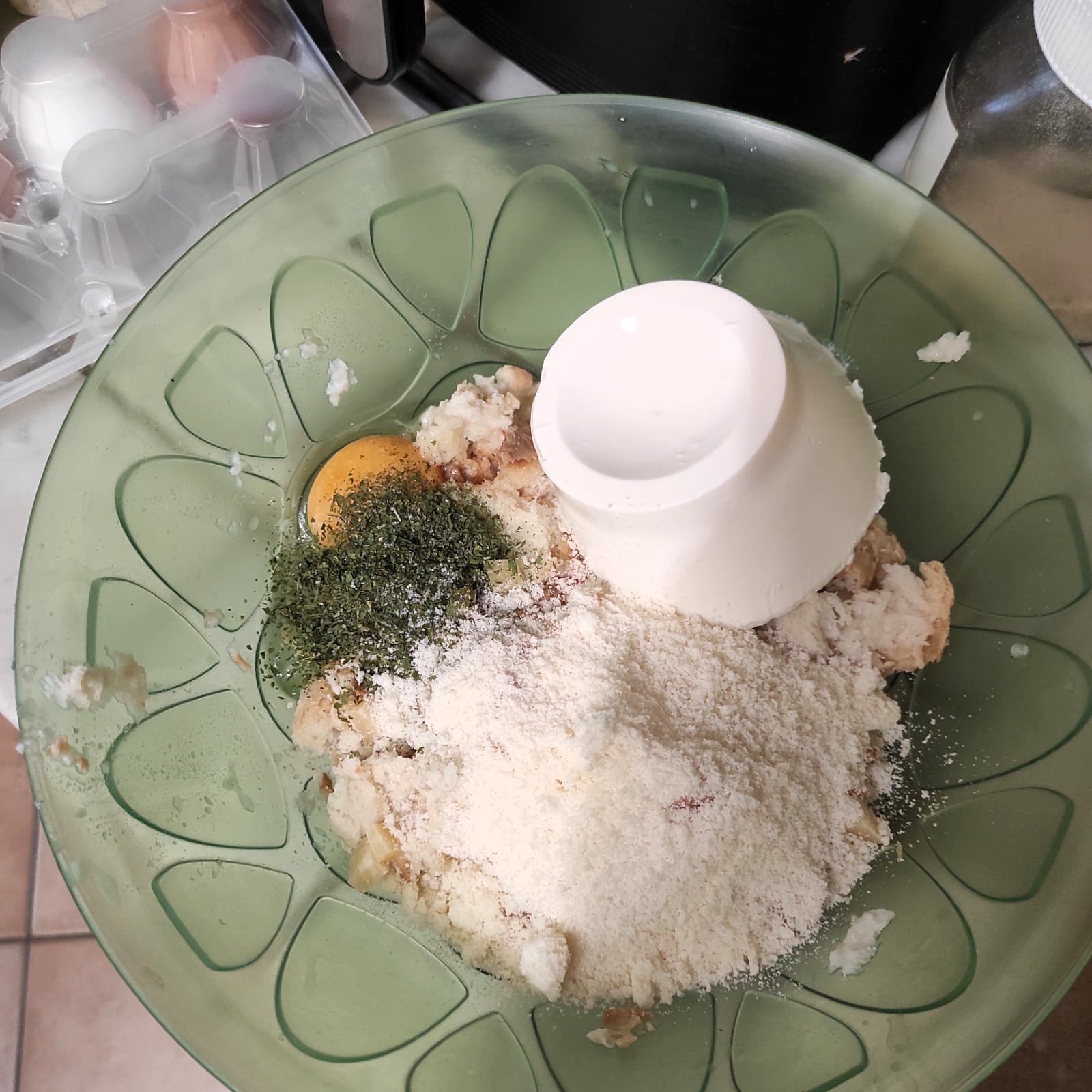 Per prima cosa, dedicatevi al pane raffermo. Tagliatelo a pezzi e mettetelo in ammollo in una ciotola con acqua fredda (o latte, per un risultato ancora più morbido) finché non sarà completamente spugnoso. Strizzatelo poi con forza tra le mani: deve perdere quanta più acqua possibile e risultare una poltiglia compatta.
