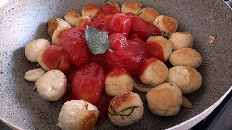 Preparate il sugo di pomodoro. In un tegame, sufficientemente grande per contenere tutte le polpette di pollo che avete fatto, versate un filo di olio di oliva e fate soffriggere lo spicchio d’aglio, cipolla e rosmarino; fate soffriggere le polpette da entrambi i lati, per pochi secondi, quindi versate i pomodori pelati, sale e pepe: per una versione più leggera, potete saltare questo passaggio e far cuocere le polpette di pollo direttamente nel sugo.
