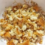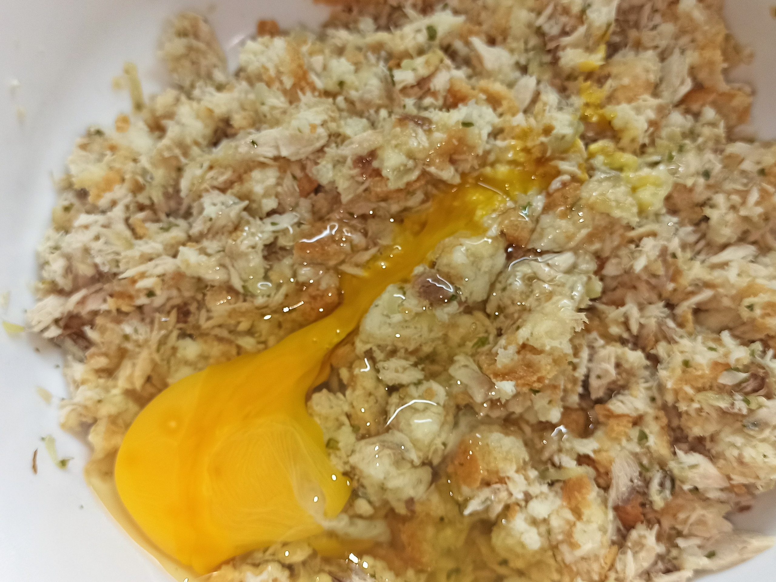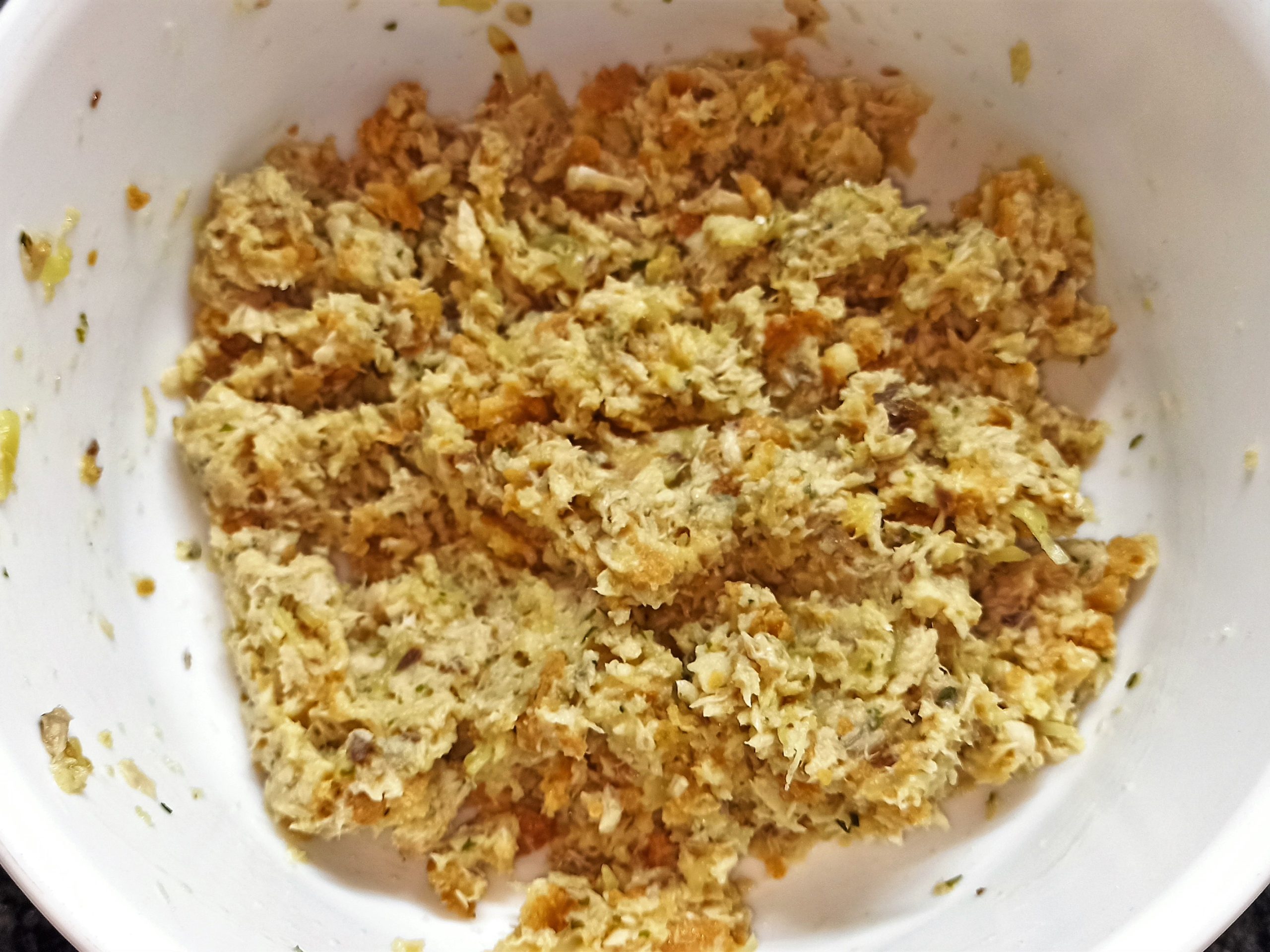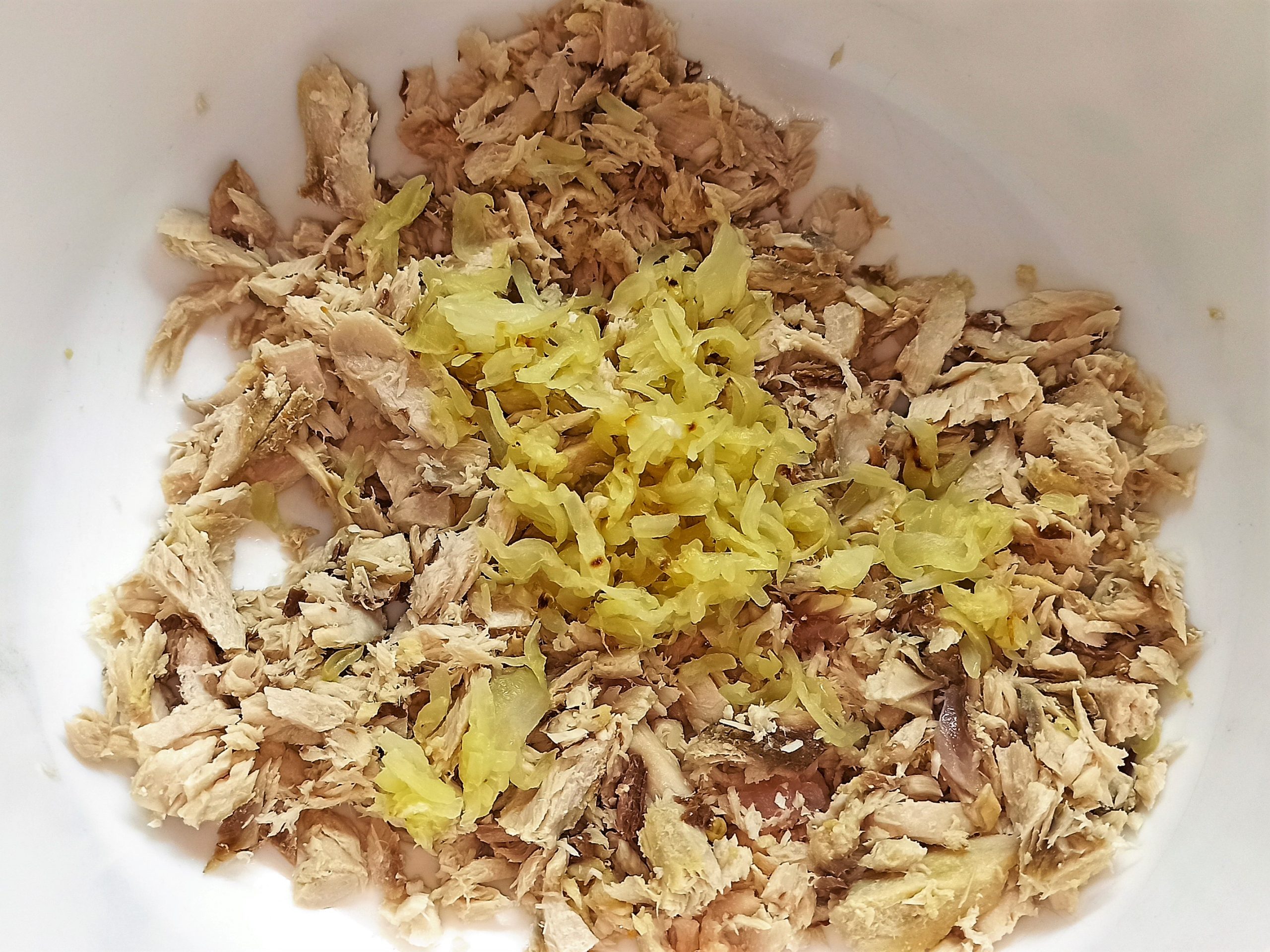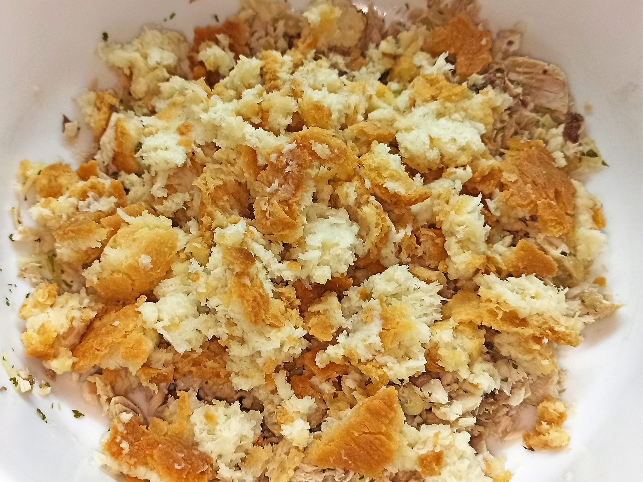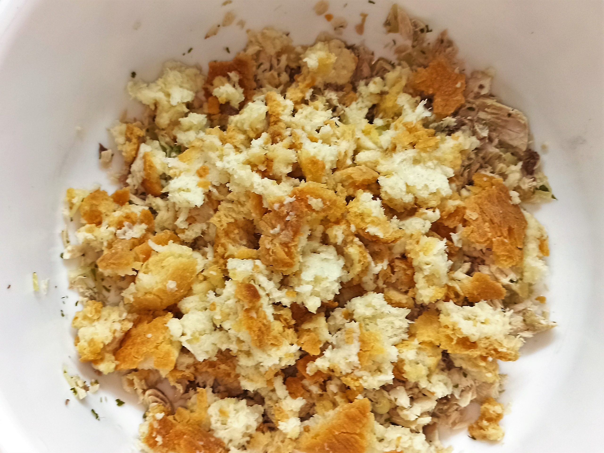 In una ciotola mettete a bagno il pane, per questa operazione potete usare sia il latte che l’acqua. Strizzatelo e riponetelo in una ciotola asciutta, unite il tonno, il prezzemolo tritato e le cipolle, mescolate bene.