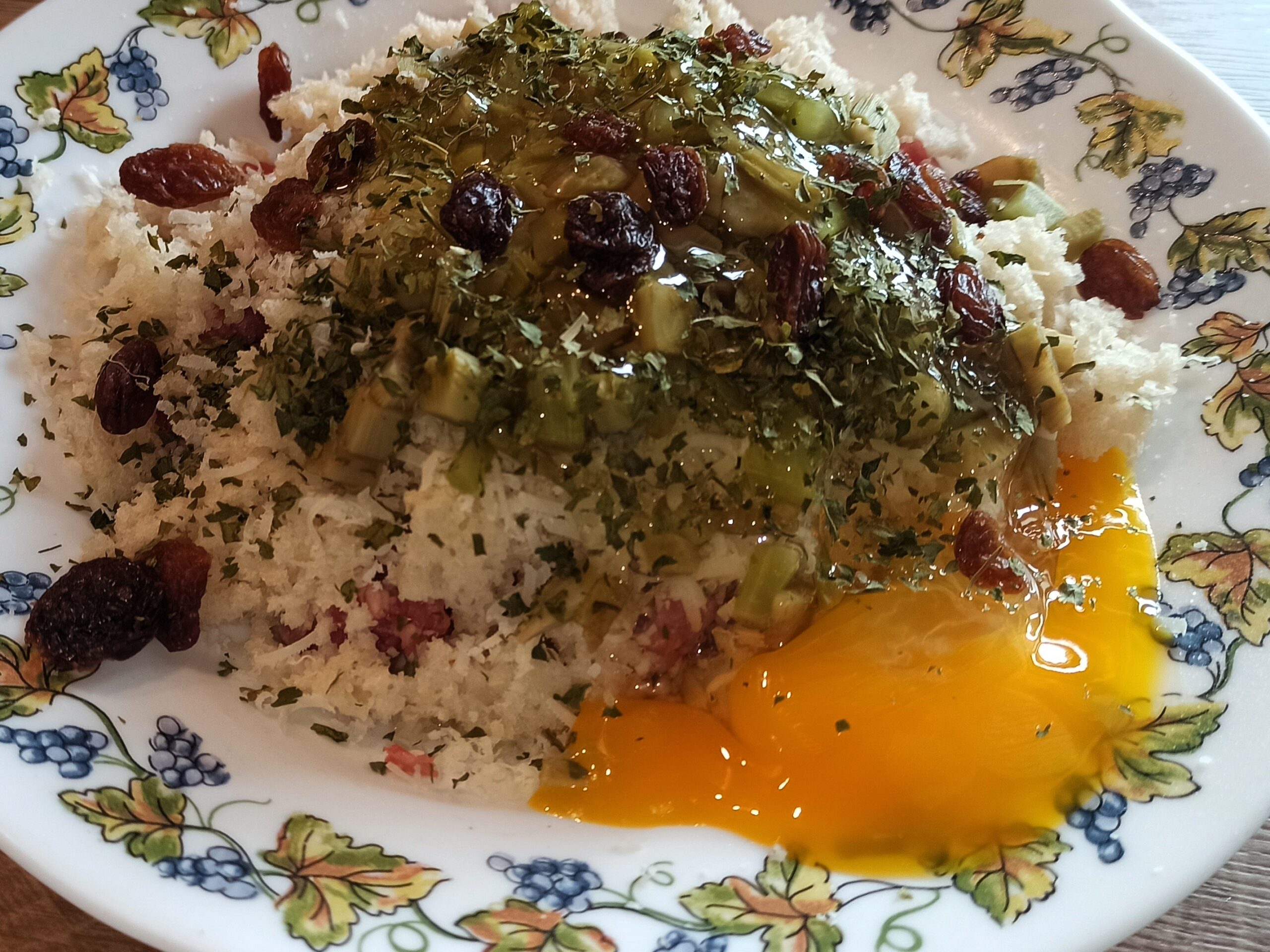 Mettete a bagno il pane, poi strizzatelo e mettetelo nella ciotola, poi aggiungete i carciofi, l’uva passa, il prezzemolo, l’aglio in polvere, il pecorino, l’uovo, regolate di sale.
