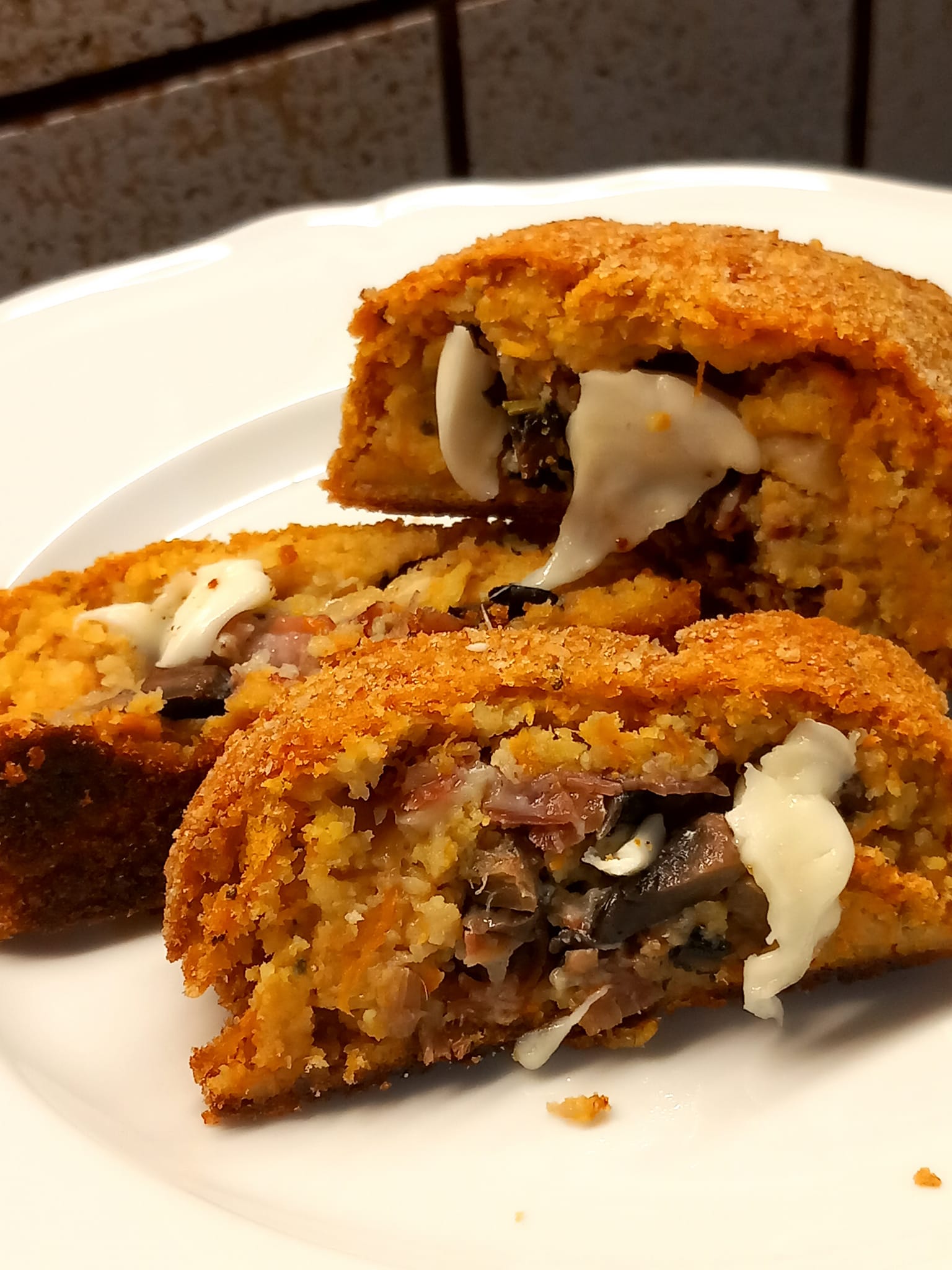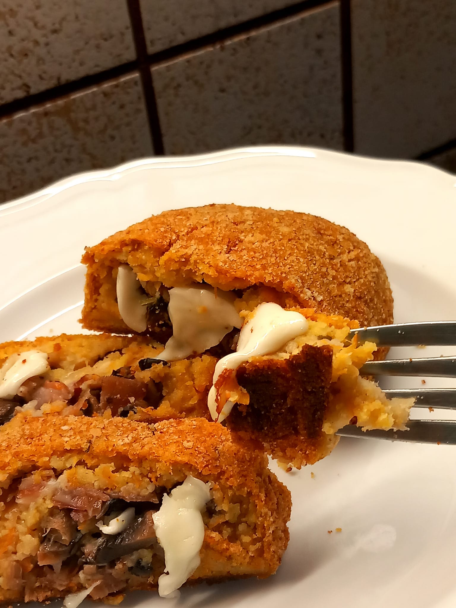 Lessiamo le patate e schiacciamole uniamo la zucca anche questa schiacciata poi aggiungere le uova, il grana, il pangrattato e formiamo un impasto omogeneo. Mettiamo il tutto sopra un foglio di carta forno precedentemente spennellato con un filo di olio extravergine e una spolverata di pangrattato. Schiacciamo leggermente, riempire con lo speck, la scamorza ed i funghetti trifolati.