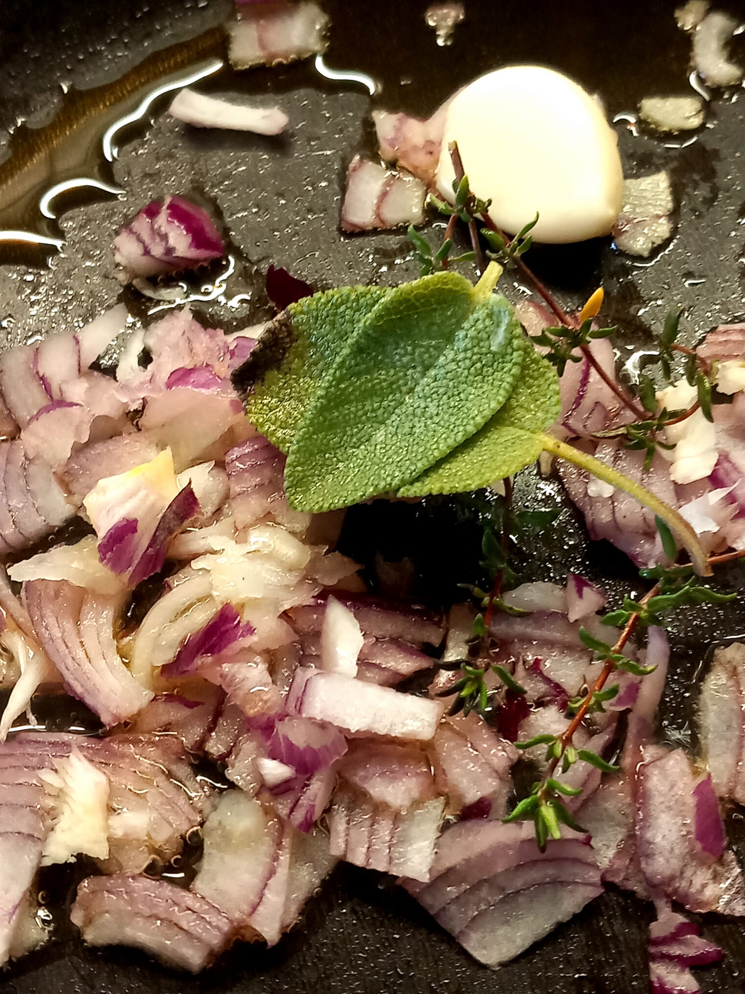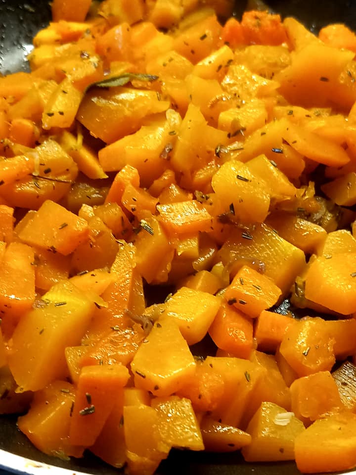 Puliamo la zucca tagliamola a fette non troppo sottili e mettiamola in forno a 180x 20 minuti circa. In alternativa come ho fatto io questa volta tagliatela a dadini e lasciatela andare in padella con uno spicchio di aglio intero (che poi toglieremo) e della cipolla tritata, profumando il tutto con timo, salvia e rosmarino.