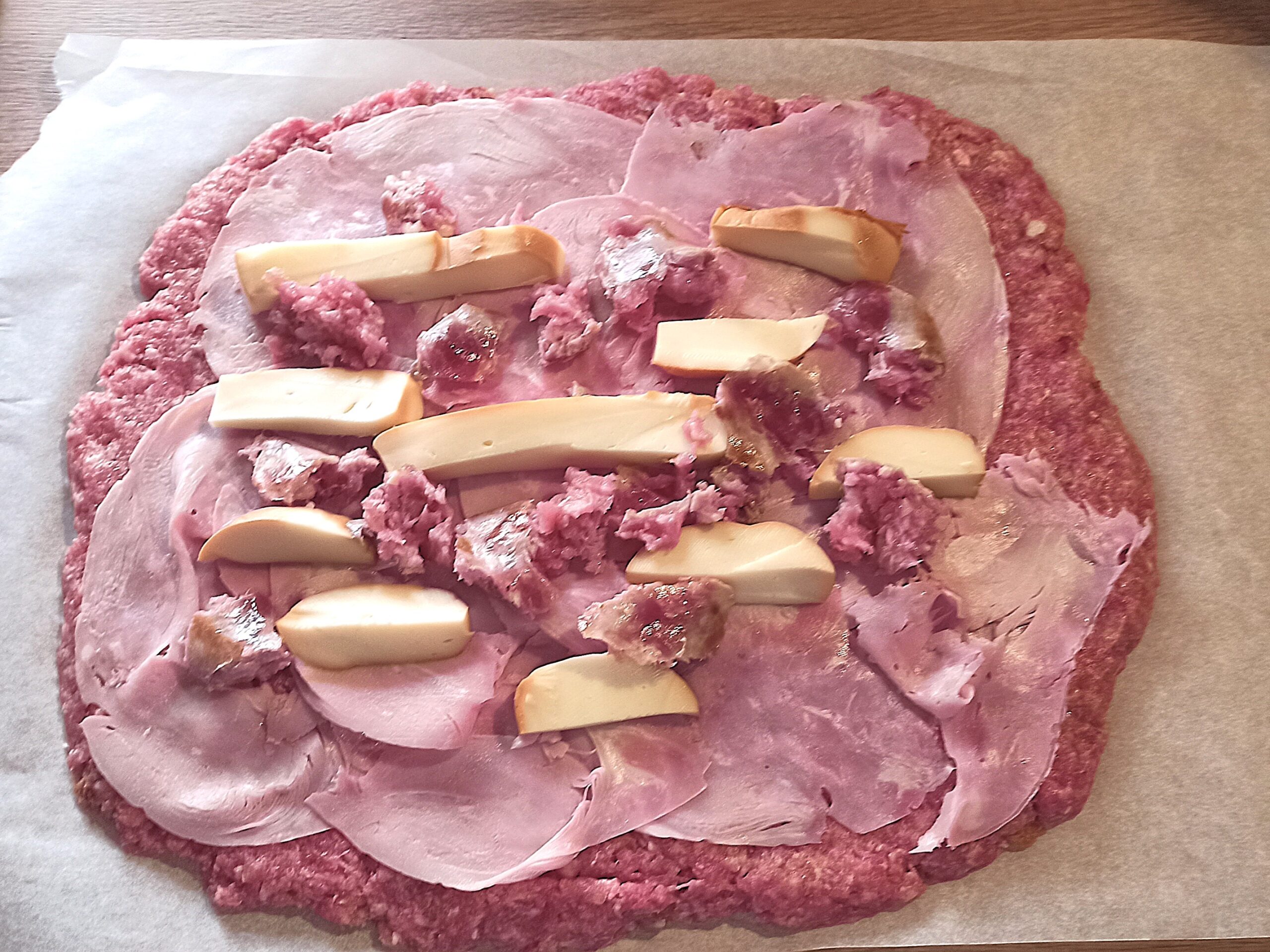 Posizionate in superfice le fette di prosciutto cotto, e la scamorza tagliata a pezzetti, e la salsiccia disgranata.