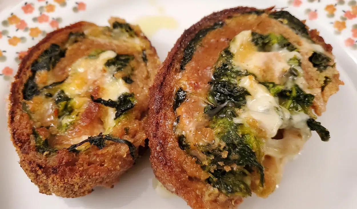 Distribuisci uniformemente i friarielli sulla carne, lasciando liberi i bordi. Aggiungi sopra i pezzetti di salsiccia e la provola a cubetti. Con l’aiuto della carta da forno, arrotola delicatamente il polpettone, sigillando bene i bordi per evitare che il ripieno fuoriesca durante la cottura. Passa il polpettone nel pangrattato per ricoprirlo uniformemente.