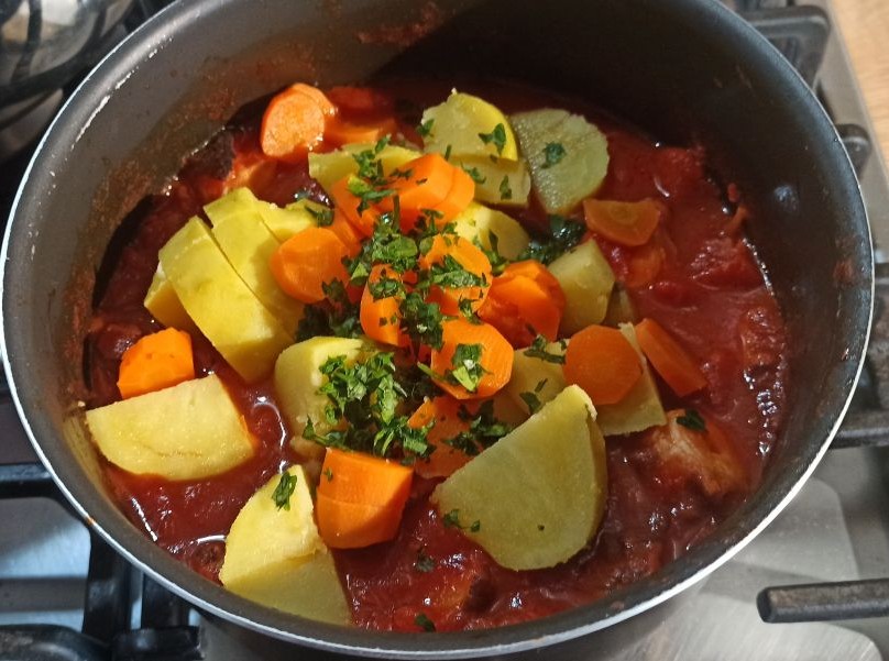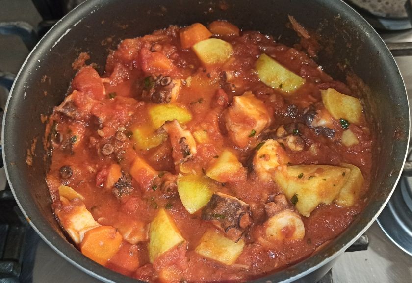 Nel frattempo, tagliate a pezzetti anche la patata e la carota, e aggiungetela al polpo, insieme al prezzemolo,