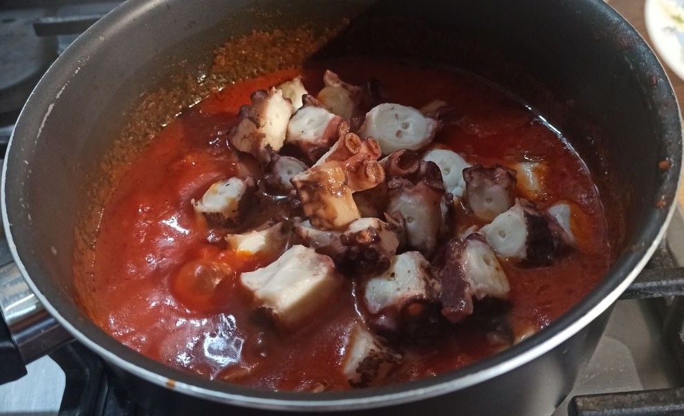 In un capiente pentolino, mettete un giro abbondante di olio evo, fate imbiondire ed eliminate lo spicchio d’aglio. Aggiungete i pomodori pelati, leggermente schiacciati, un mestolo di acqua di cottura del polpo, fate cuocere per dieci minuti. poi aggiungete il polpo, regolate di sale, e fate cuocere per circa dieci minuti.