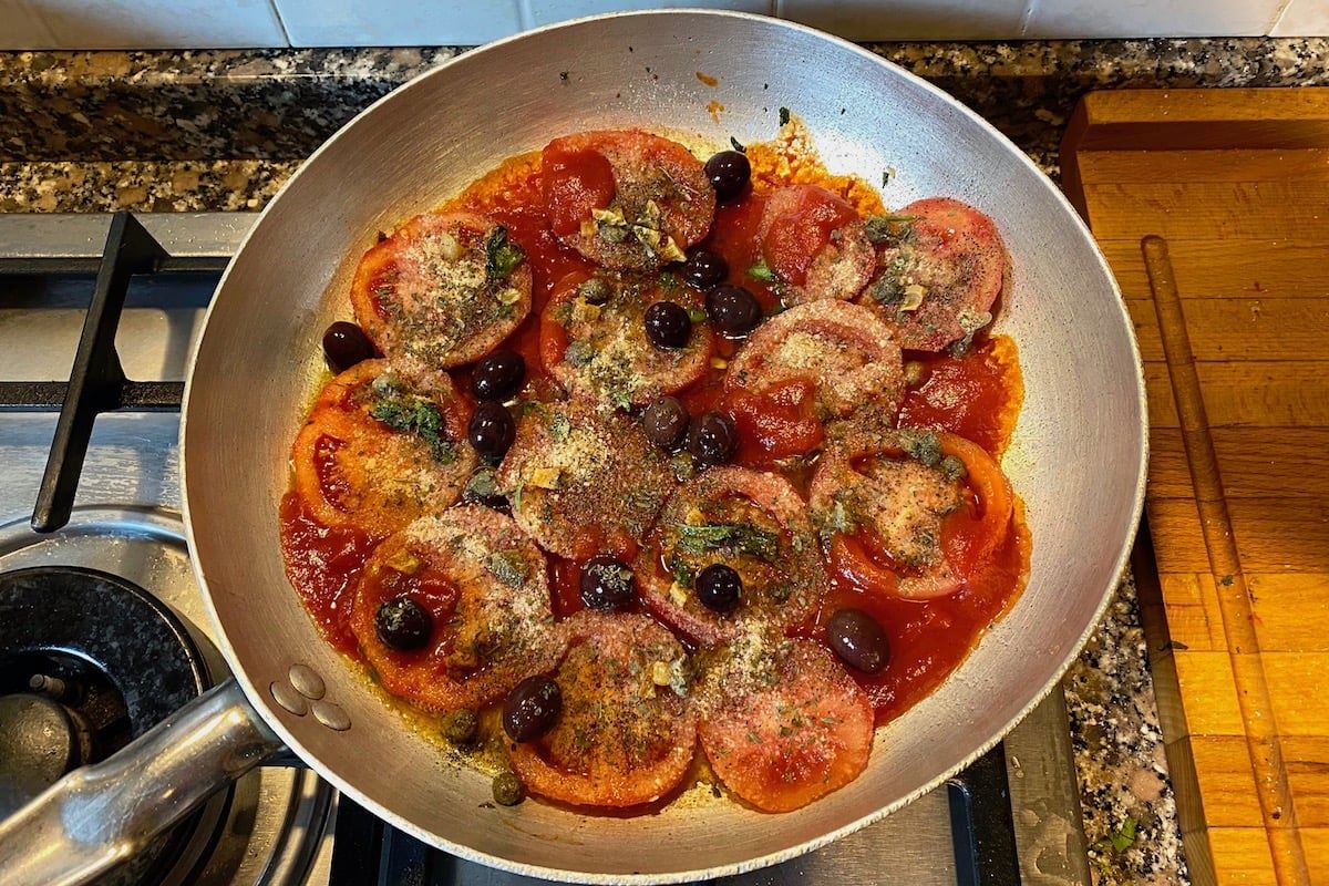 Versate l’olio in una padella ampia e fatelo scaldare a fuoco dolce. Unite l’aglio e lasciatelo soffriggere lentamente finché non diventa dorato. Aggiungete quindi il peperoncino e metà del prezzemolo tritato , mescolando per far insaporire l’olio. Spegnete il fuoco, distribuite uniformemente il soffritto sul fondo della padella e adagiate sopra le fette di pomodoro . Versate la salsa di pomodoro in modo sparso, poi salate, pepate e spolverate con il pangrattato . Completate con origano , basilico , olive nere e capperi. Coprite la padella con un coperchio e rimettete sul fuoco a fiamma dolce. Lasciate stufare lentamente per 5-10 minuti , senza mescolare, finché i pomodori saranno teneri ma non sfatti.