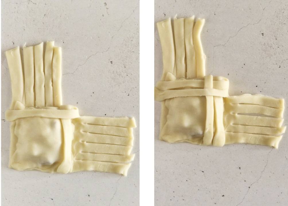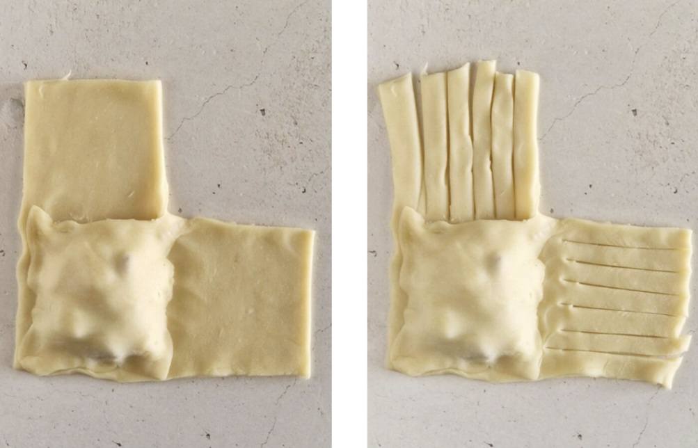 Richiudete ogni fagottino piegando la pasta su sé stessa, formando triangoli o rettangoli sigillati. Premete bene i bordi con le dita o con i rebbi di una forchetta per evitare che si aprano in cottura.