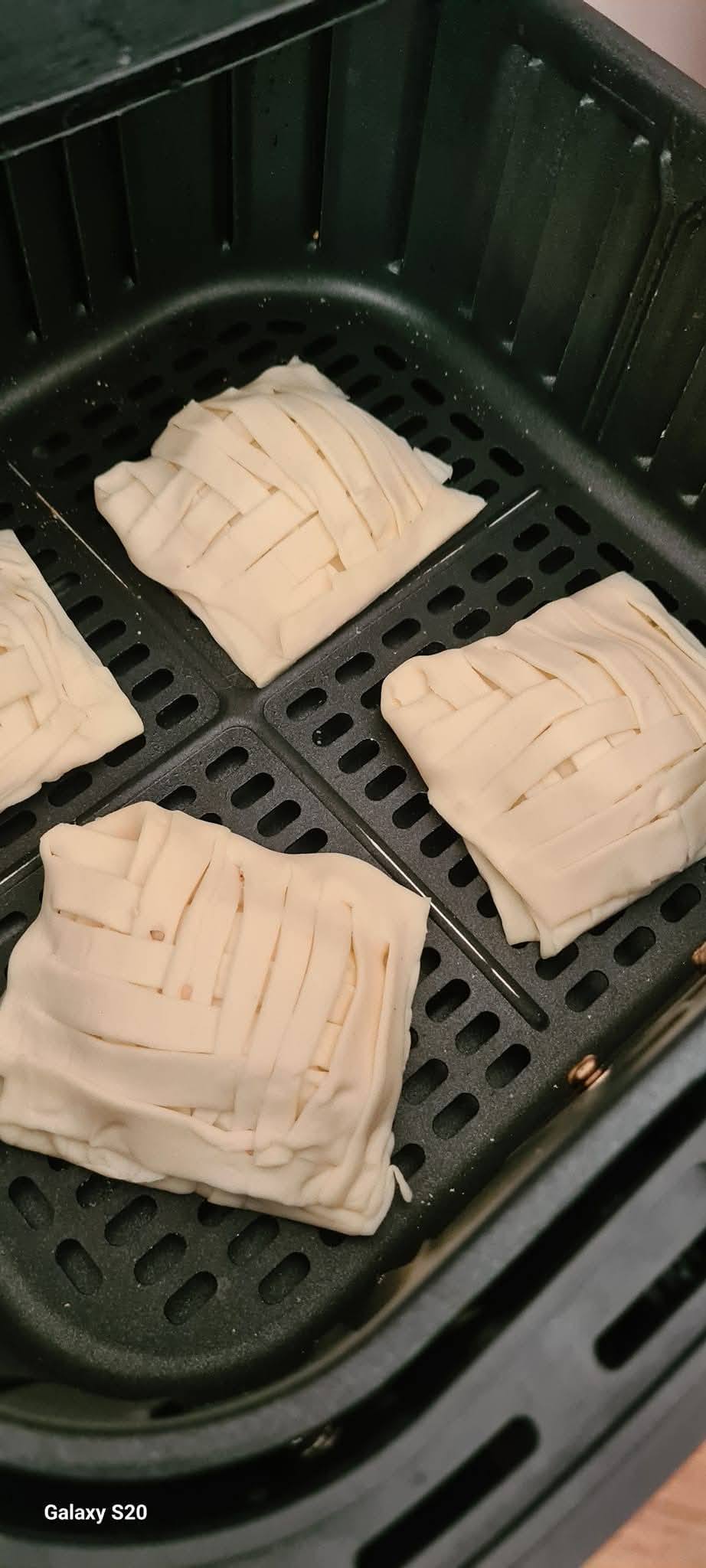 Preriscaldate la friggitrice ad aria per 2 minuti a 200°C. Sistemate i fagottini nel cestello, distanziandoli leggermente tra loro. Cuocete a 180°C per circa 13 minuti, fino a doratura completa. Ogni friggitrice può variare leggermente nei tempi, quindi controllate a metà cottura. Se necessario, potete girarli per una doratura uniforme da entrambi i lati.