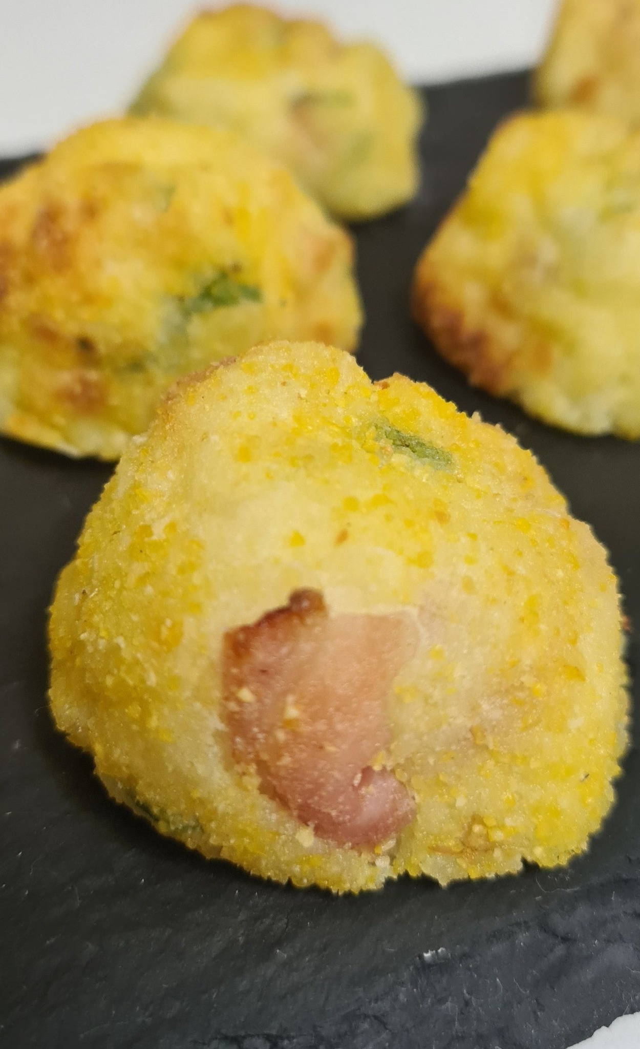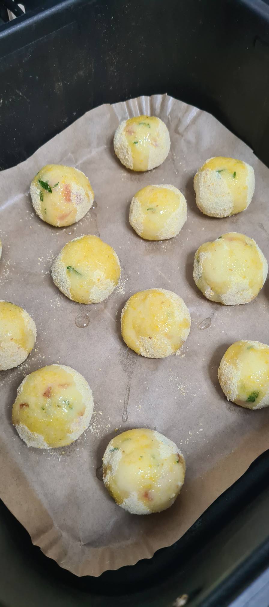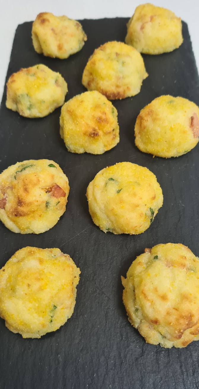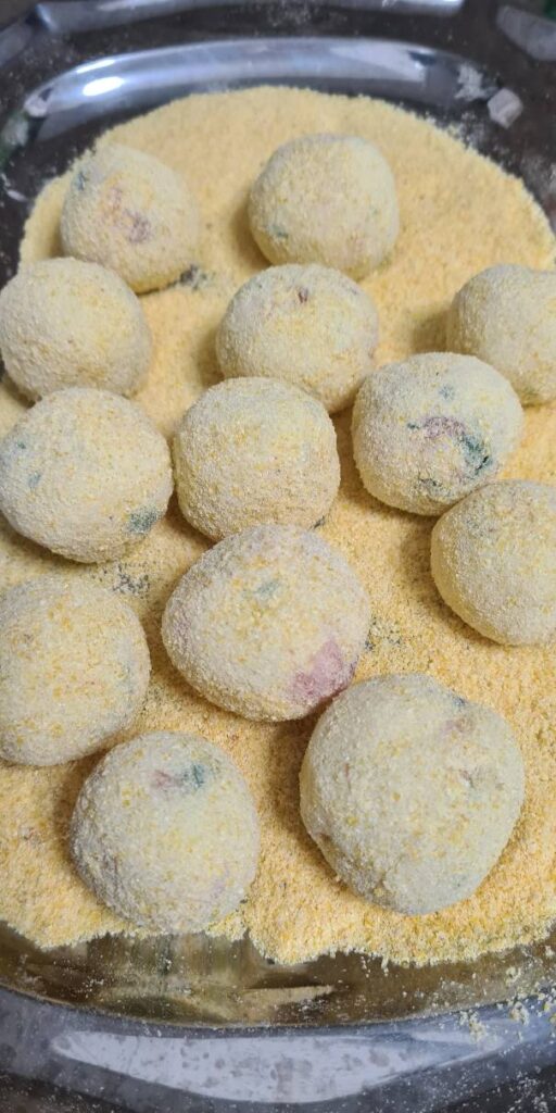 Forma le palline con le mani leggermente umide. Passale una ad una nella farina di mais per una panatura rustica e croccante. Sistema le palline su un foglio di carta forno nella friggitrice ad aria (o su una teglia se usi il forno tradizionale). Spruzza la superficie con un po’ d’olio. Cuoci a 200°C per 8 minuti in friggitrice ad aria. Se usi il forno statico, prosegui la cottura per 15 minuti circa, girandole a metà cottura.