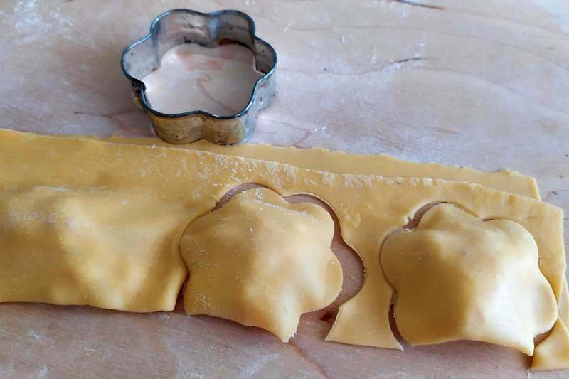 risvoltate metà di striscia sul ripieno, premete la pasta intorno al ripieno e ritagliate i ravioli con uno stampo della forma a piacere: tondo, rettangolare o a fiore.