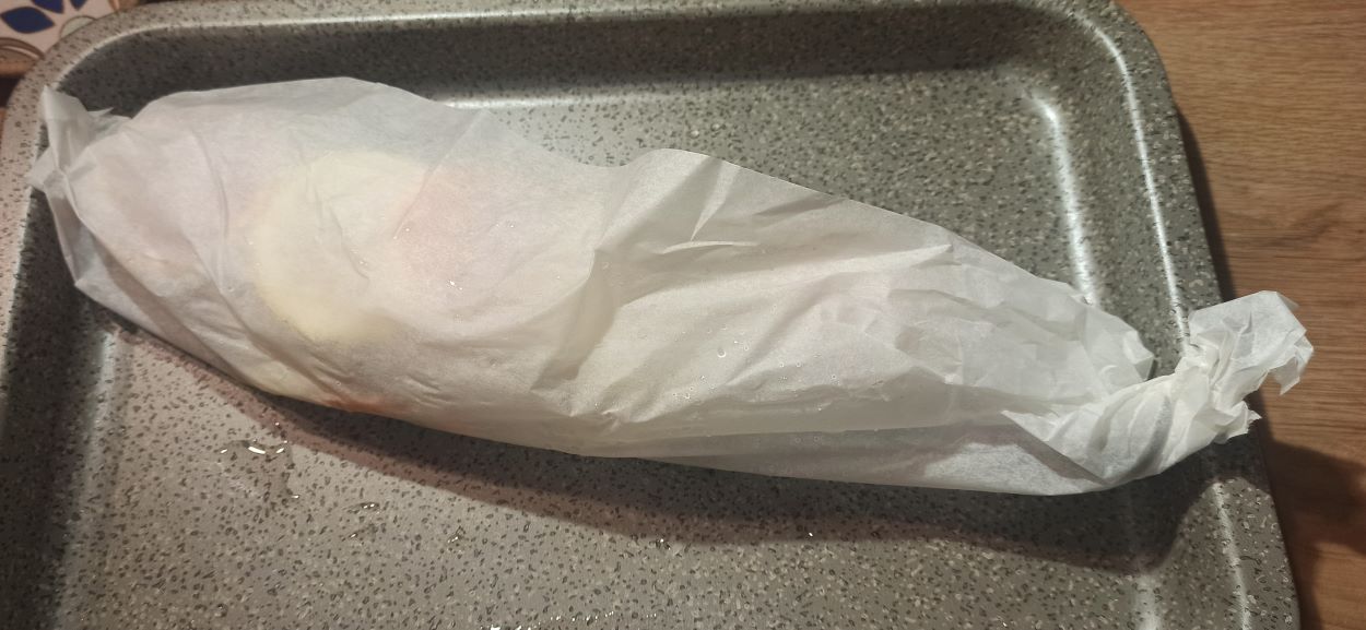 Irrorate la superfice con altro olio evo, e chiudete la carta forno su se stessa, fino a formare il classico cartoccio, a forma di caramella.