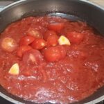 In una capiente padella, mettete un paio di giri abbondanti di olio evo, aggiungete lo spicchio d’aglio. Fate sfrigolare qualche secondo, poi aggiungete i pomodorini divisi in due ed i pomodori pelati schiacciati.