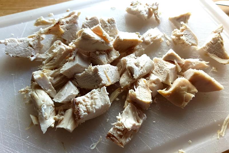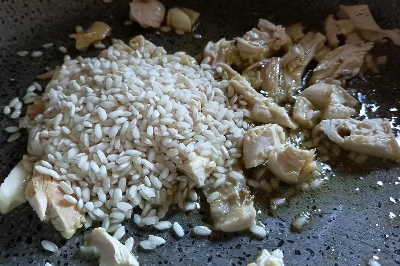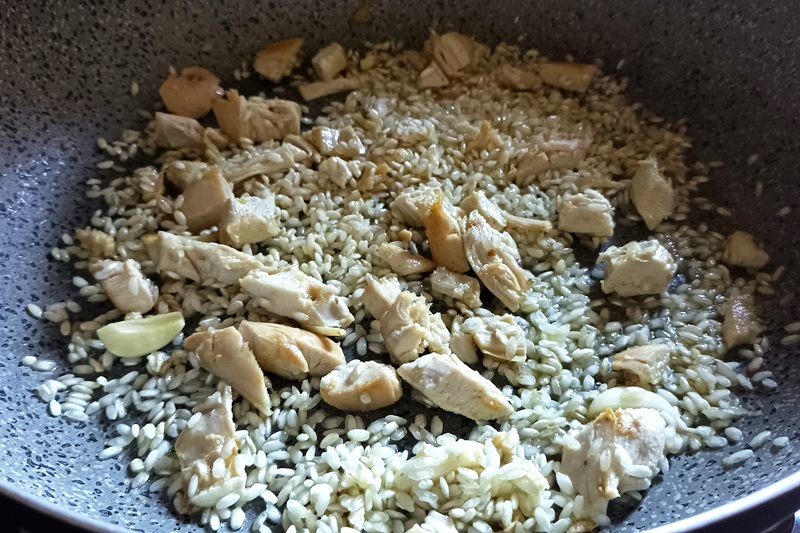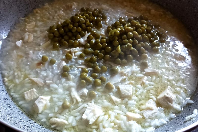 Lessati i piselli ed il petto di pollo in acqua bollente salata; quando cotti, togliete il petto di pollo e scolate i piselli tenendo da parte il brodo di cottura. In una padella versate un filo d’olio ed uno spicchio d’aglio, e fatelo dorare; aggiungete il petto di pollo tagliato a dadini e fatelo insaporire per qualche minuto.
