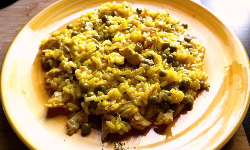 Il curry è una miscela di spezie di origine indiana, utilizzata nella cucina asiatica, generalmente composta da cumino, curcuma, pepe nero, peperoncino e zenzero: con il suo profumo inebriante ed il colore dorato è il protagonista assoluto di questa ricetta, un delizioso piatto esotico, dall’intenso sapore speziato.Riso al curry, con pollo e piselli