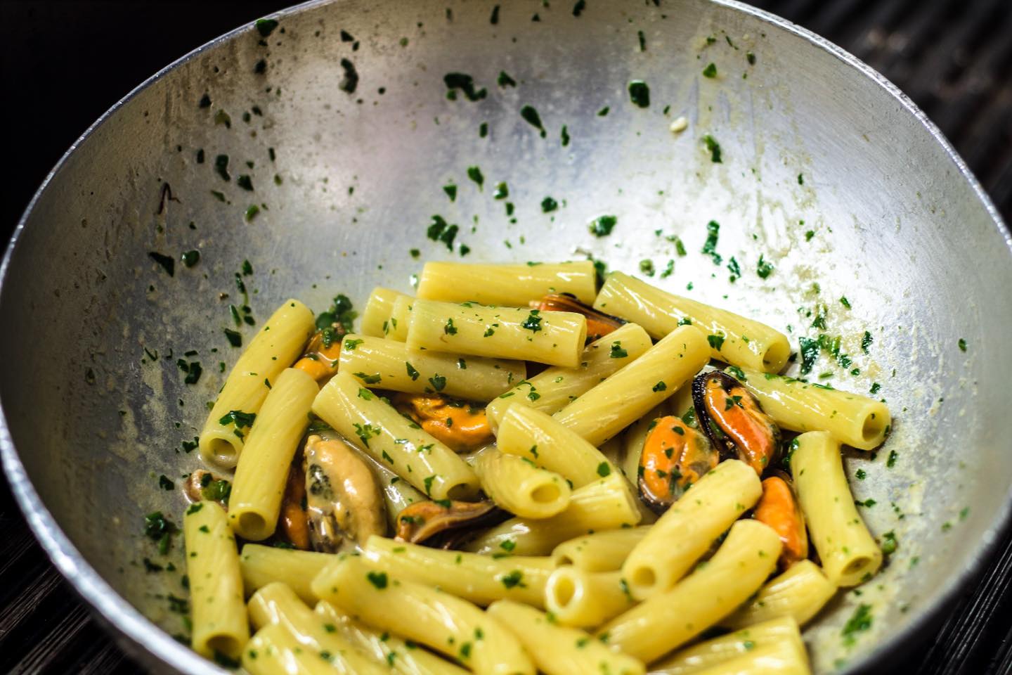 Togliete le cozze dalle valve e mettetele da parte, filtrando il loro liquido con un colino. Lessate i rigatoni in acqua non salata. Le cozze infatti sono già molto sapide, così come il pecorino.