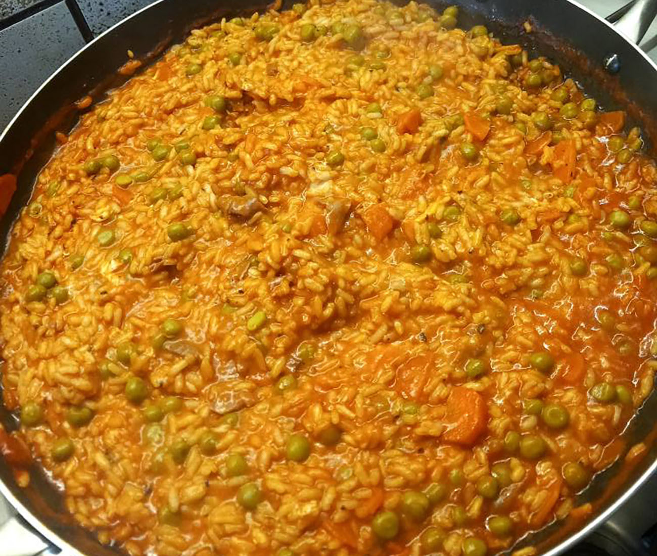 In una padella capiente, fate tostare il riso per un paio di minuti con un filo di olio extravergine d’oliva. A parte, scaldare il brodo vegetale (o l’acqua con un pizzico di sale). Unite al riso i piselli in umido e il prosciutto tagliato a listarelle. Fatevi insaporire per qualche minuto, mescolando con un cucchiaio di legno. Aggiungete 3 mestoli di brodo , in modo che il riso sia ben coperto. Man mano che il brodo si asciuga, continuare ad aggiungerne un mestolo alla volta fino alla cottura completa del riso.