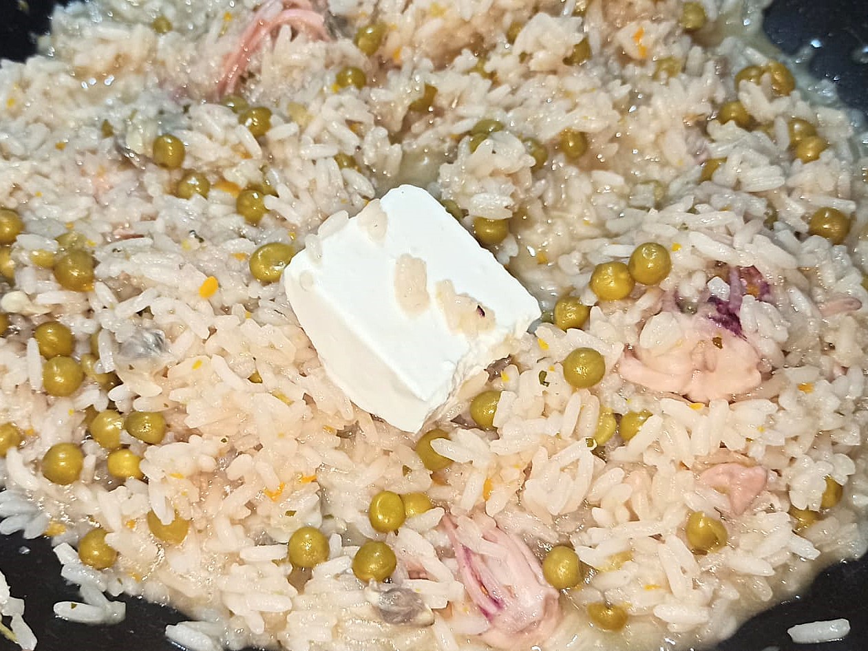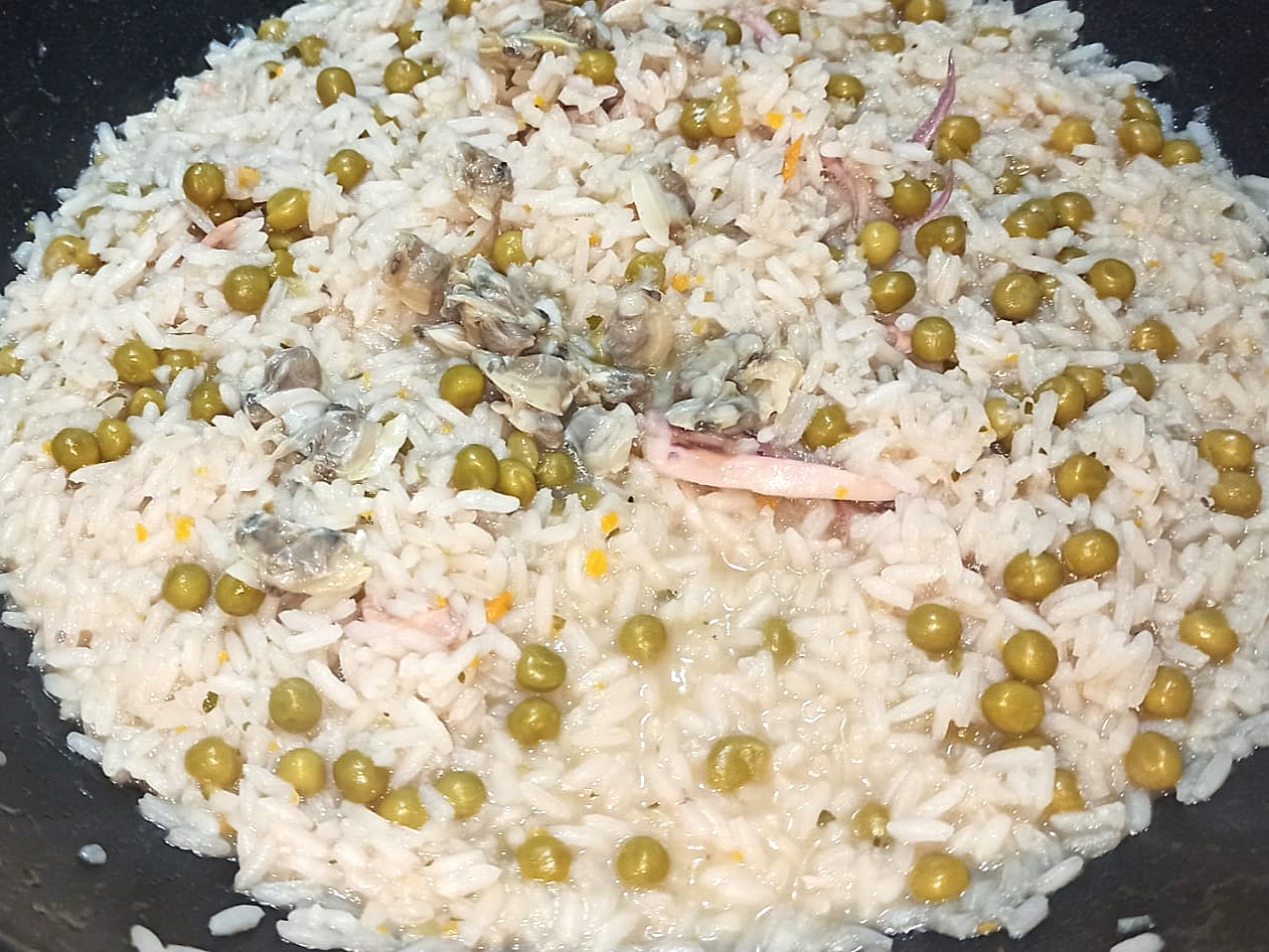 Riso e bisi, è una ricetta della cucina veneta. La ricetta che di seguito andremo a preparare, è una saporitissima variante di quella originale. Il condimento viene preparato, aggiungendo ai classici piselli, anche ingredienti che ci fornisce il mare, ed il riso invece di venire cotto con brodo vegetale, viene cotto con il fumetto di pesce. Ovviamente non ci sono degli ingredienti precisi da aggiungere, ma come sempre potete utilizzare quelli che avete in casa. Ma adesso vediamo insieme come preparare questo gustosissimo piatto.