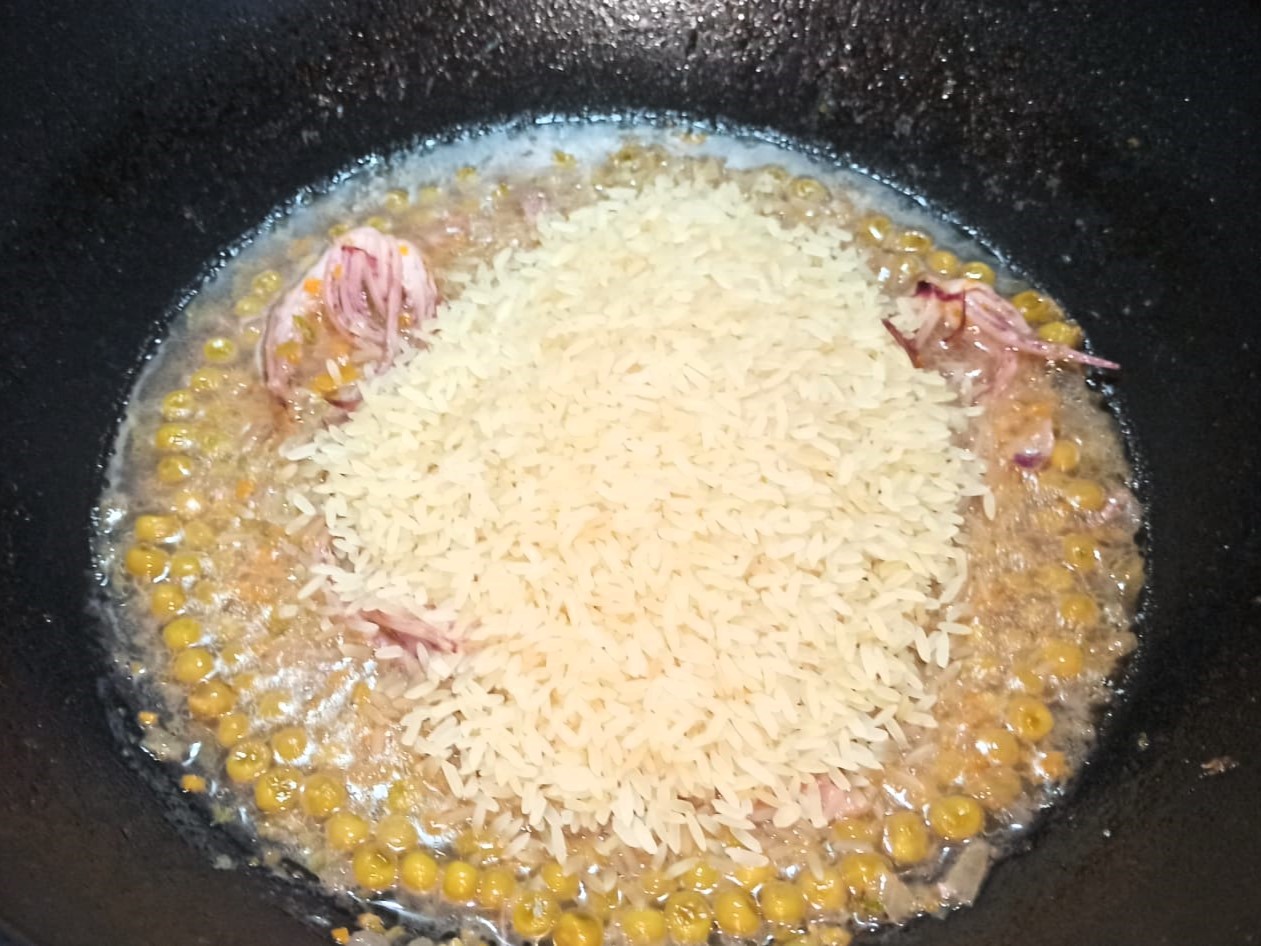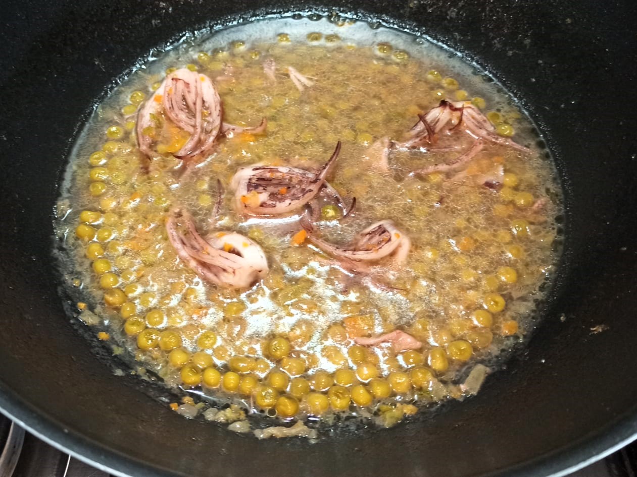 Fate evaporare l’alcol, aggiungete i piselli e un poco di fumetto, lasciate cuocere cinque minuti.