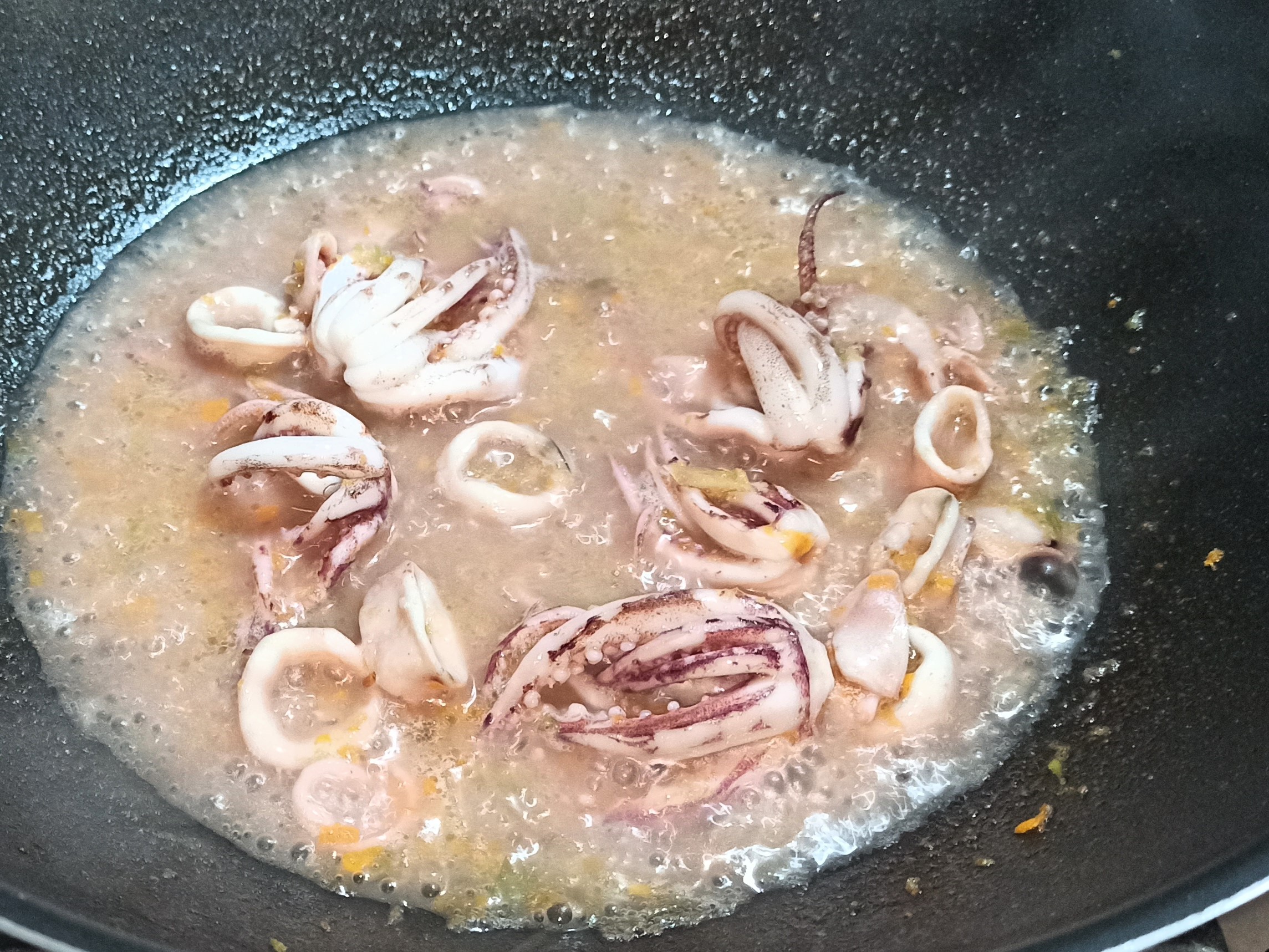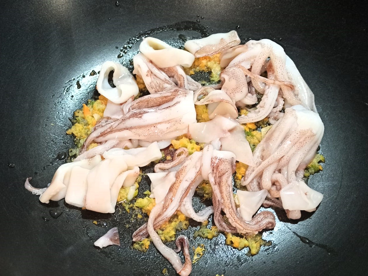 A cottura ultimata, filtrate il brodetto, e eliminate la testa e le lische dall’orata. Tenete i filetti ricavati in caldo. Fate aprire i lupini, lasciateli intiepidire e sgusciateli, filtrate il liquido rilasciato ed unitelo al fumetto. In una capiente padella, aggiungete un paio di giri abbondanti di olio evo, unite le verdure tritate, e fate sfrigolare a fiamma media. Tagliate i totani ad anelli, ed aggiungeteli al soffritto, insieme ai tentacoli.