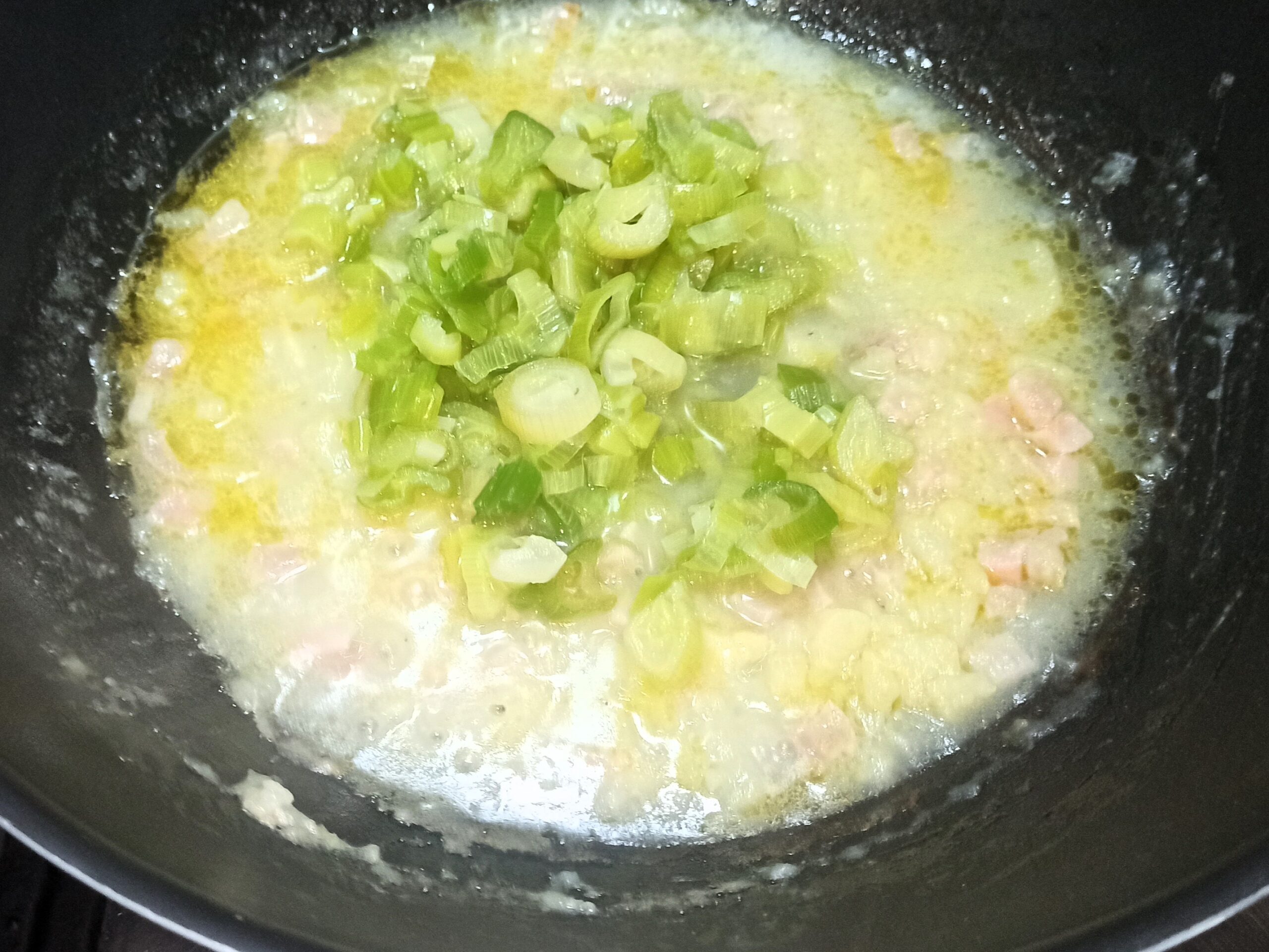 Fate cuocere a fiamma media, e regolate di sale. Appena le patate saranno cotte, aggiungete i gambi dei cipollotti,