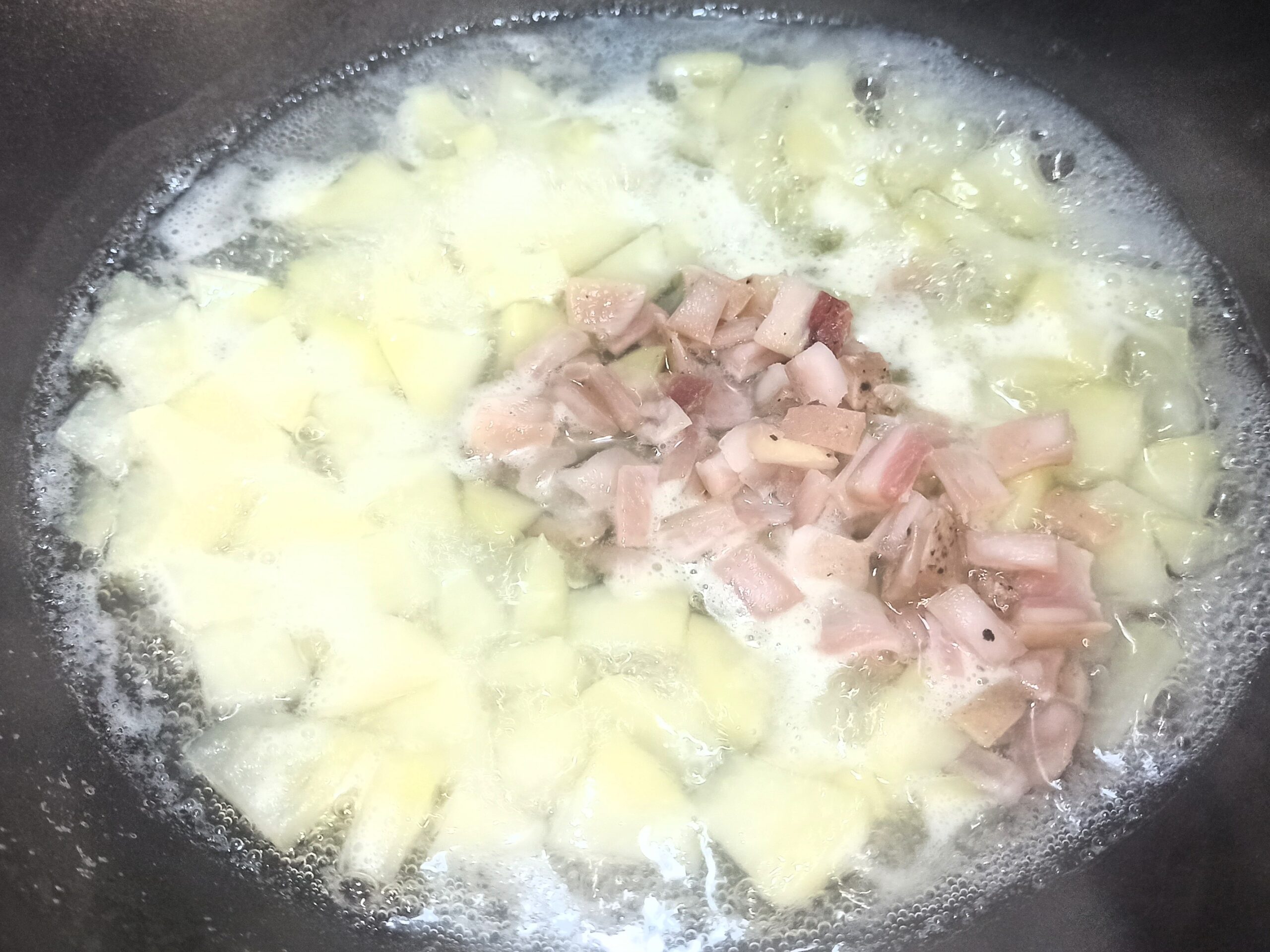 Pelate, lavate e tagliate a tocchetti le patate. In una capiente padella, mettete un paio di giri abbondanti di olio evo, aggiungete le patate, e l’acqua di cottura dei gambi dei cipollotti, aggiungete anche la pancetta e la cotenna, tagliata a tocchetti.