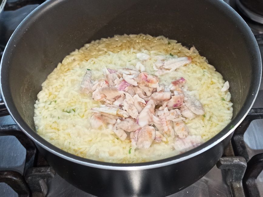poi sfumate con il vino. Appena l’alcol sarà evaporato, aggiungete un poco di brodo, e iniziate la cottura del risotto, aggiungendo altro brodo a bisogno. A cottura quasi ultimata, aggiungete le triglie, amalgamate delicatamente.