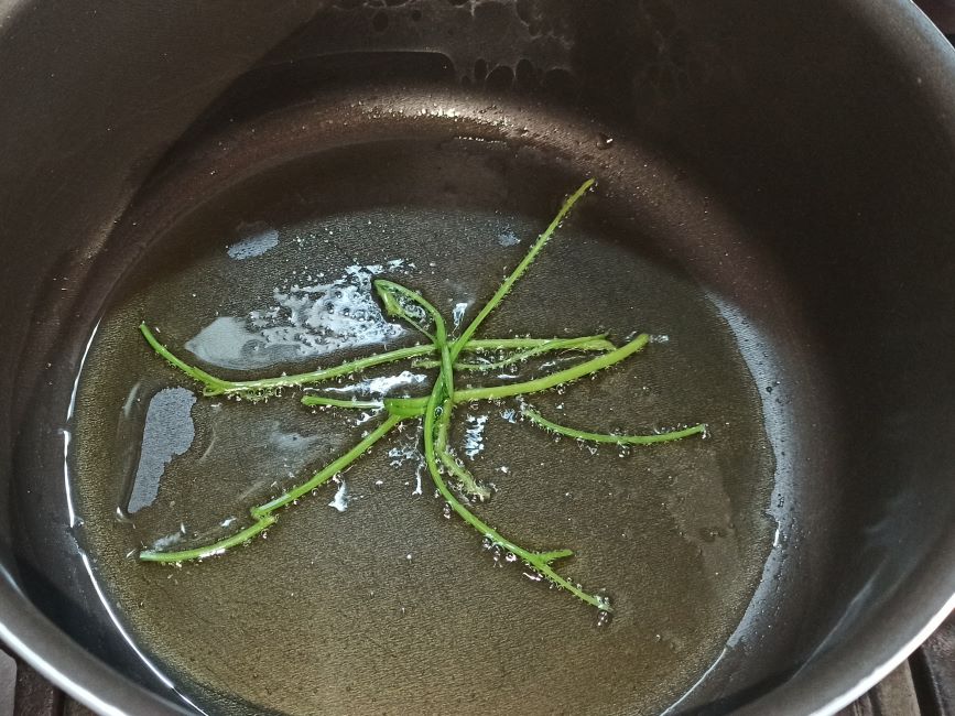 Per preparare il risotto con triglie e crema di prezzemolo, iniziate a lavare e pulire le triglie, lavate anche il prezzemolo. In un pentolino mettete un paio di giri d’olio evo, fate sfrigolare i gambi del prezzemolo.