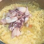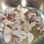 In una capiente pentola, mettete un giro d’olio evo, ed un pezzetto di burro, fate rosolare i calamari tagliati a rondelle,