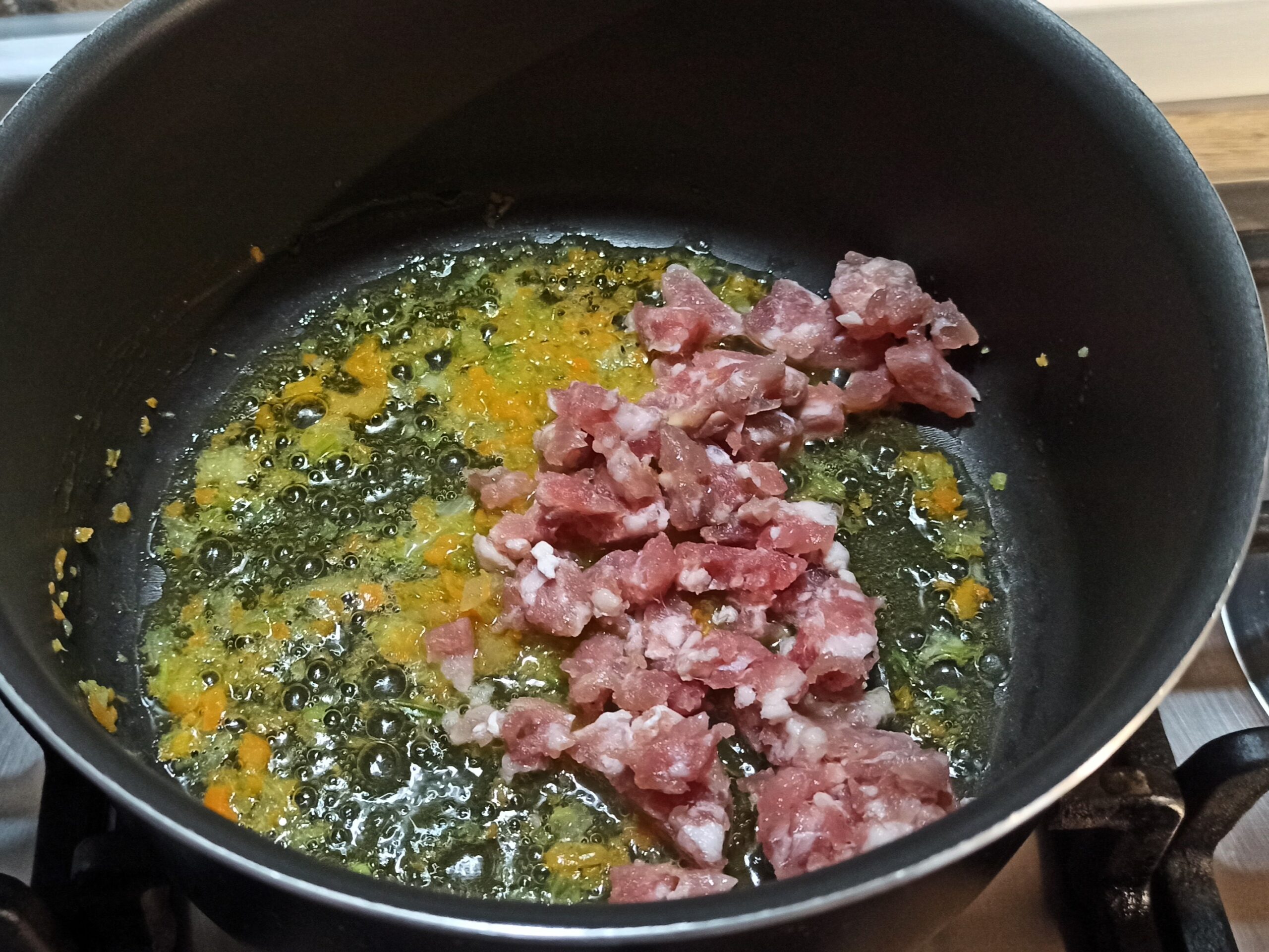 Per preparare il risotto di fine estate, iniziate a tritare le verdure. In un capiente pentolino, mettete un giro d’olio evo, aggiungete le verdure, la salsiccia priva del budello e sgranata, e fate sfrigolare a fiamma media per un minuto.