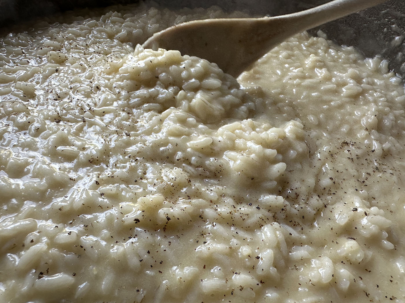 Se c’è bisogno aggiungete altra acqua. Assaggiate e aggiustate di sale. Spegnete il fuoco e passate all’impiattamento. Alla base del piatto distribuite la polvere dei pepi. Continuate con il riso, quindi completate con il limone grattugiato. Il vostro risotto cacio e 7 pepi è pronto. Incredibile come un piatto in bianco sia diventato gourmet fino a questo punto. Nonostante l’assurdità, vi possiamo assicurare che al palato è una vera goduria. Buon appetito.