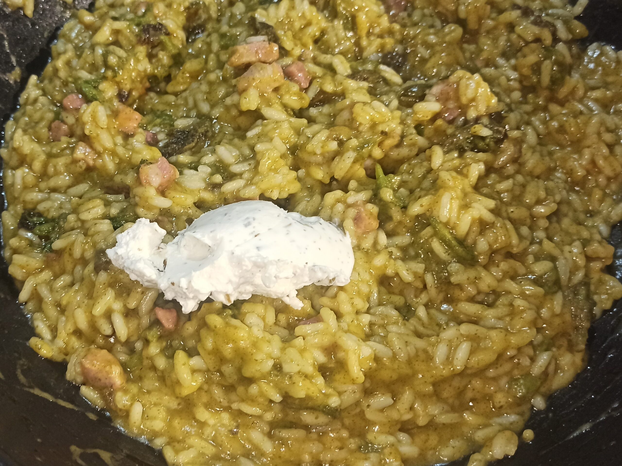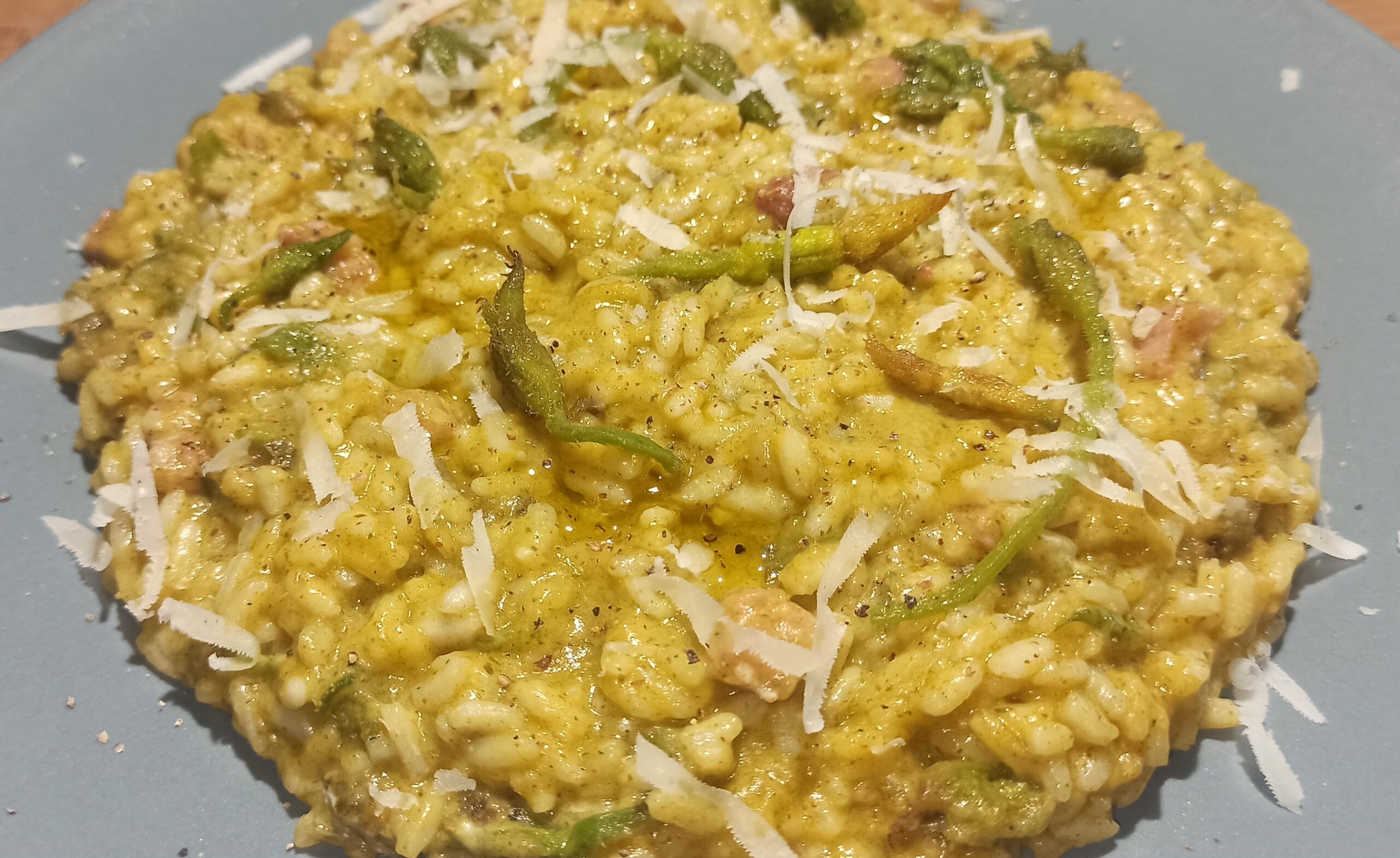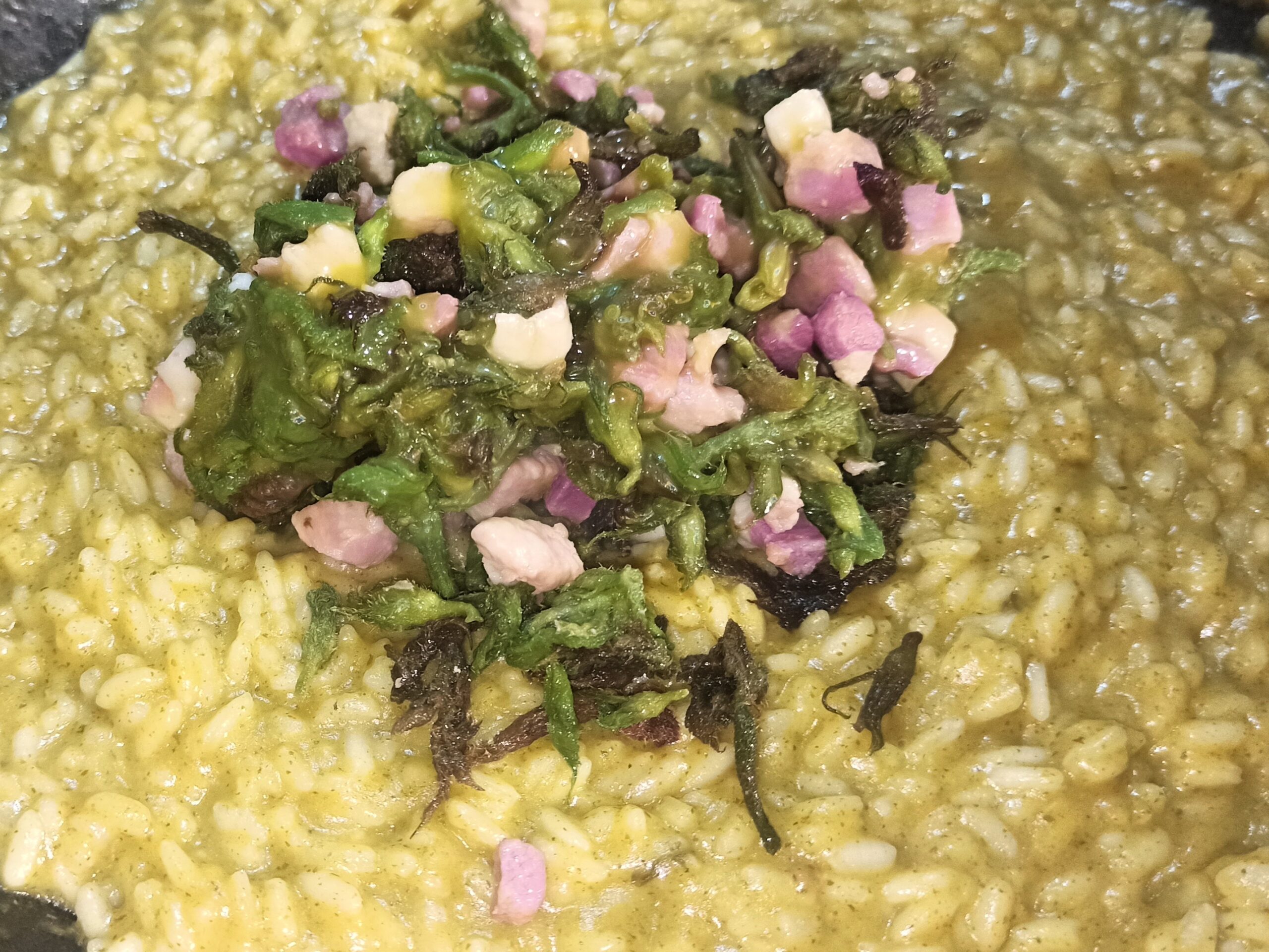Il risotto con crema di patate e tenerumi, è un primo piatto davvero delizioso e delicato. I tenerumi sono la parte finale delle piante di un tipo di zucchine siciliane. In Sicilia viene usato molto spesso in cucina, sia per preparare minestre, primi piatti e/o contorni. Per preparare il risotto, prima ho preparato una zuppetta di patate e tenerumi, tenendo da parte i fiorellini chiusi, in modo da guarnire il piatto. Poi ho frullato il tutto, e filtrato la crema ottenuta con un colino a maglie strette. Ovviamente per un primo piatto tutto vegetariano, potete eliminare la pancetta.