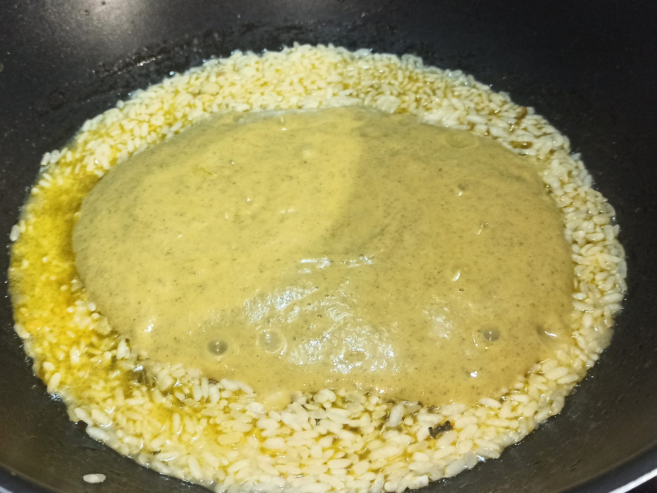 In una capiente padella mettete un paio di giri d’olio evo, fate tostare il riso, poi sfumate con il vino bianco. Fate evaporare l’alcol, iniziate a cuocere il riso, aggiungendo, a bisogno il brodo vegetale. A metà cottura, aggiungete la crema di patate e tenerumi, e continuate a cuocere, se occorre aggiungete ancora un poco di brodo vegetale.
