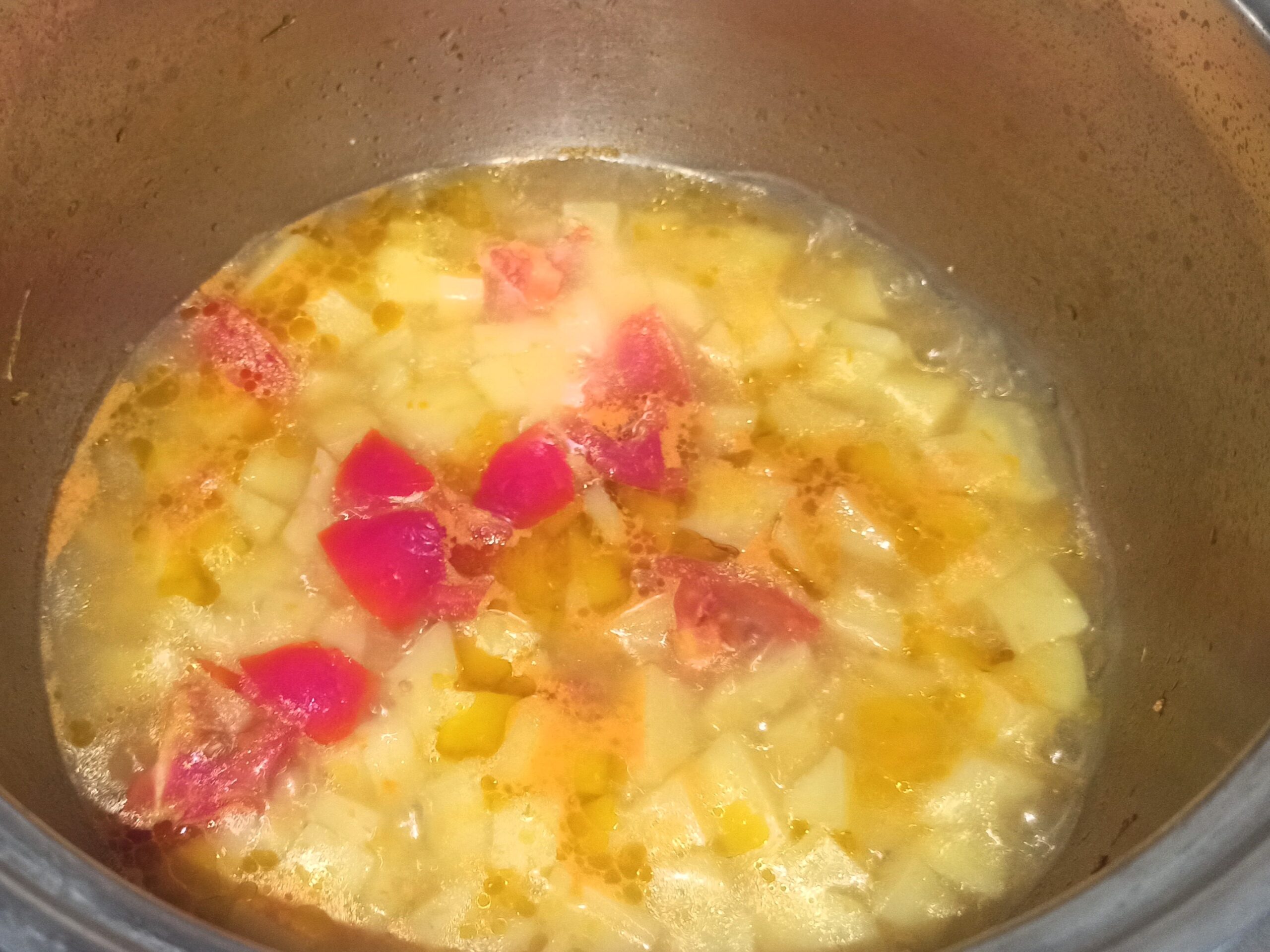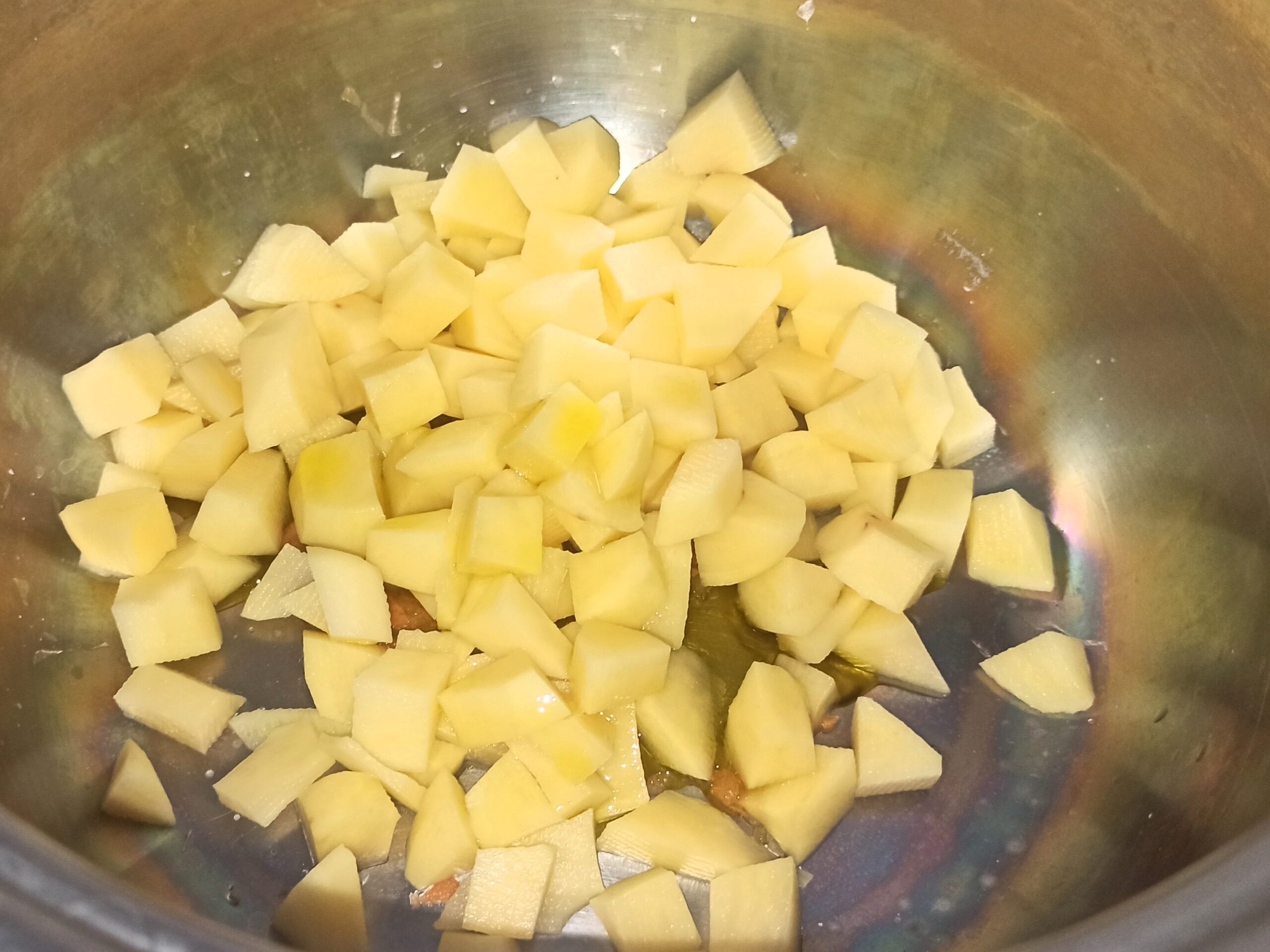 Pelate, lavate e tagliate a tocchetti la patata, mettetele in una capiente pentola, con un giro d’olio evo. Fate sfrigolare per un paio di minuti, poi sfumate con il vino bianco.