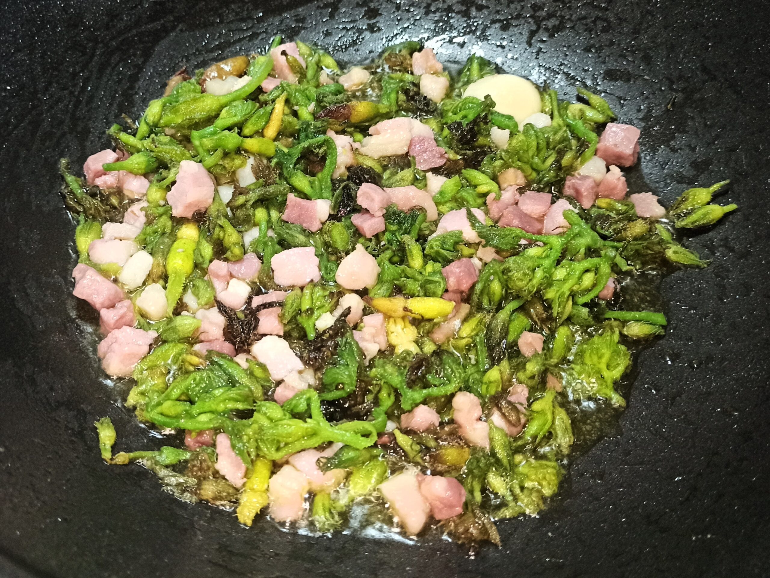 Aggiungete la pancetta i fiorellini e le foglioline,
