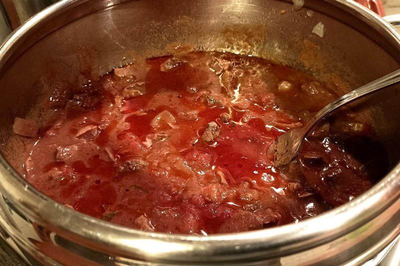 aggiungete i pelati, sale e pepe, ed un mestolo di brodo;