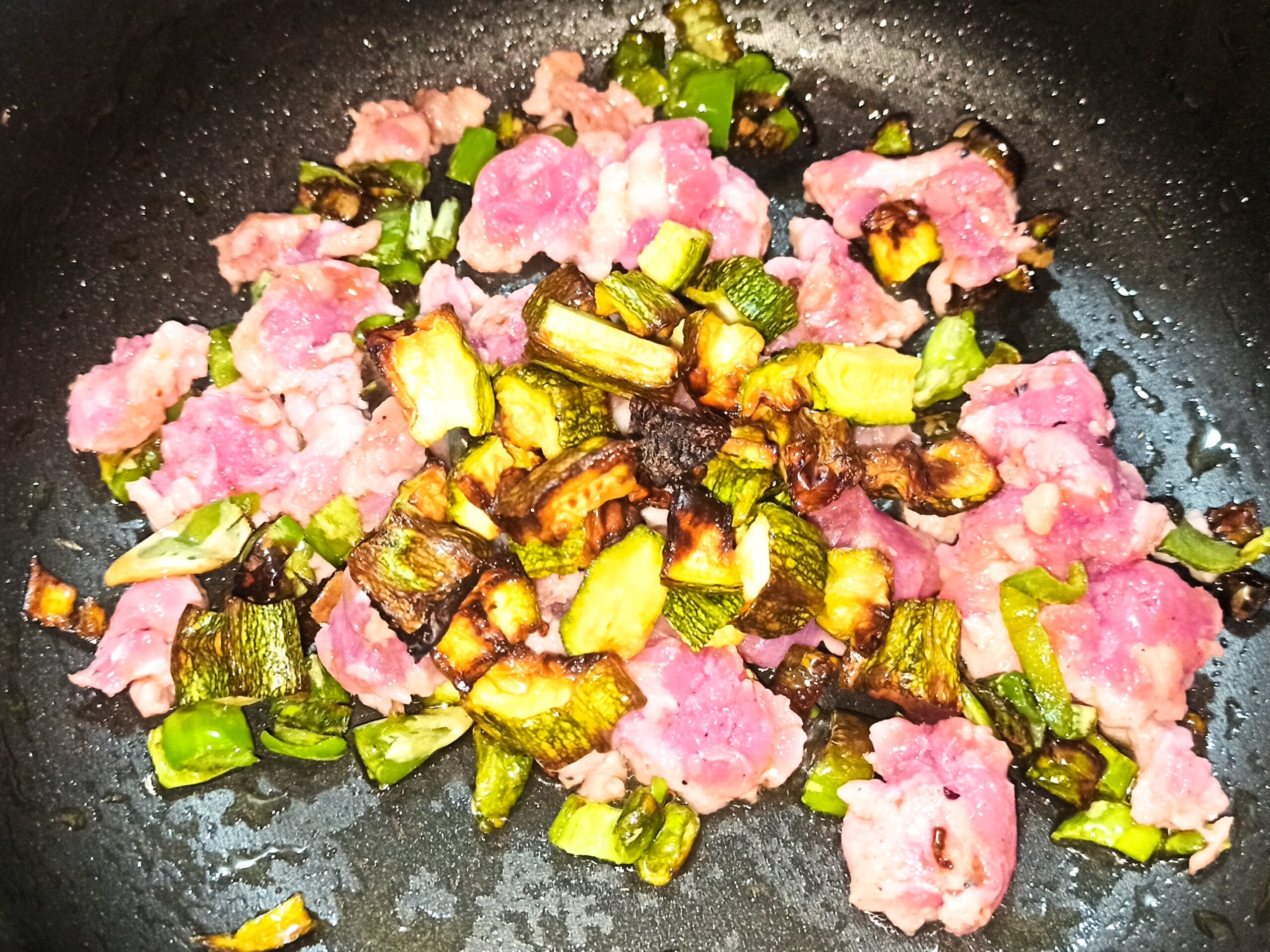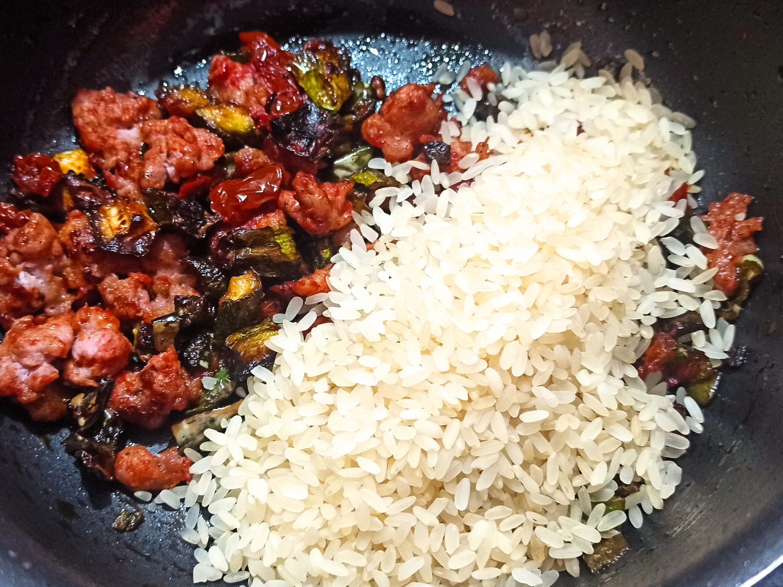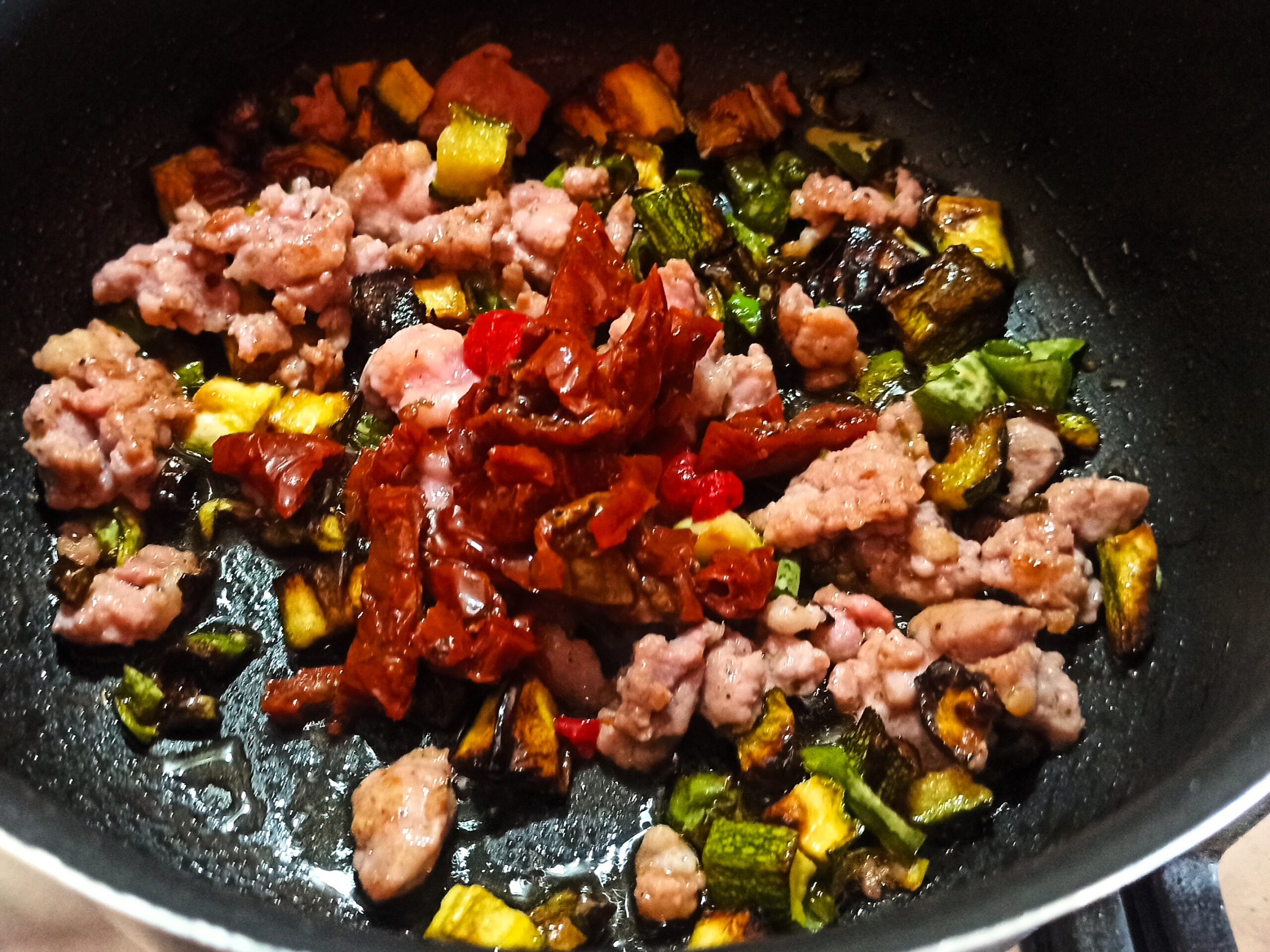 poi i peperoncini. Appena questi ultimi saranno cotti, aggiungete la salsiccia disgranata, fate rosolare per un minuto e aggiungete anche le zucchine, mescolate e sfumate con il vino bianco.