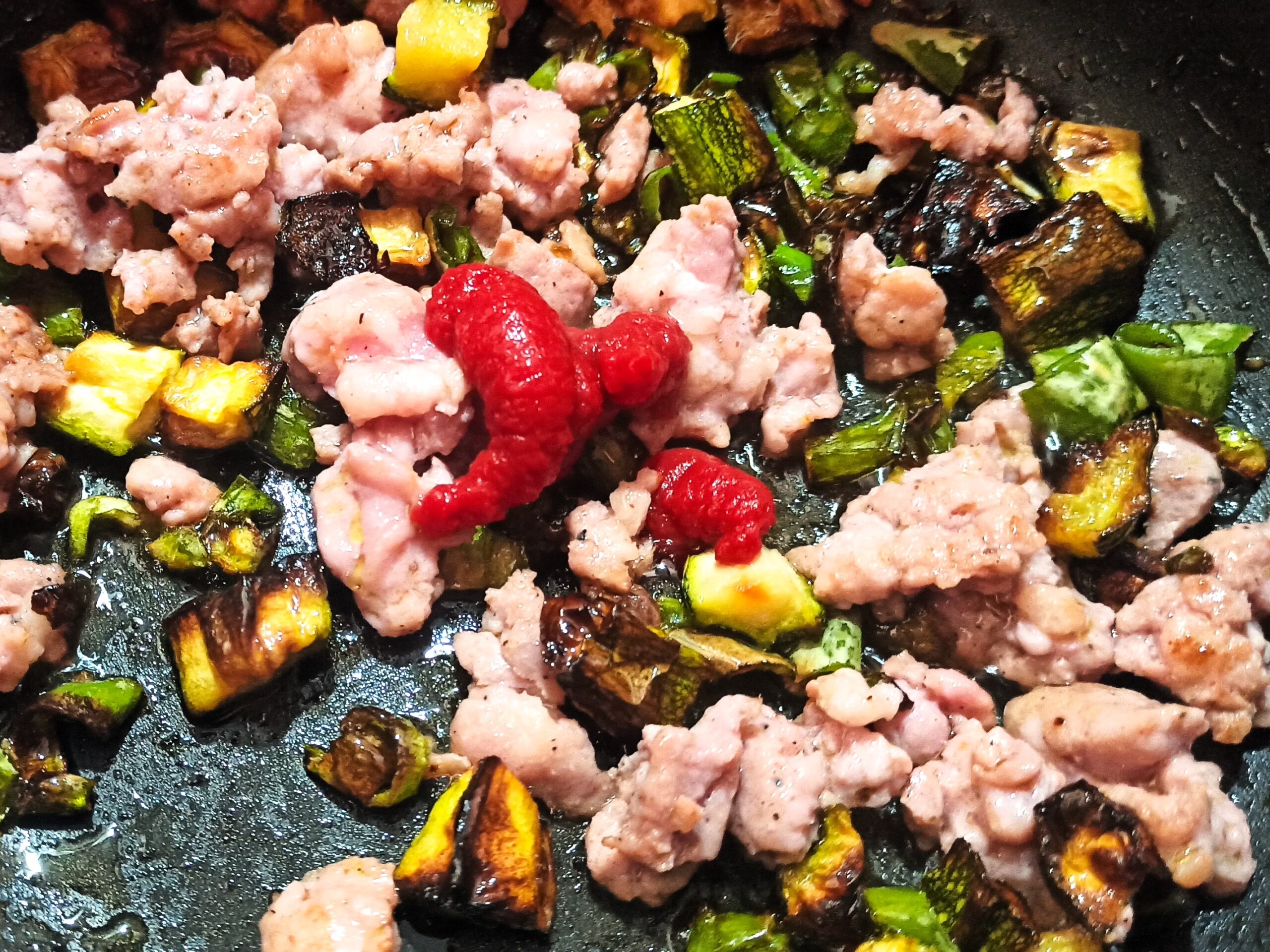 Appena l’alcol sarà evaporato, aggiungete il concentrato di pomodoro,