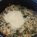 sfumate con il vino bianco, fate evaporare l’alcol, e iniziate la cottura aggiungendo il brodo a bisogno. A metà cottura, aggiungete gli spinaci.