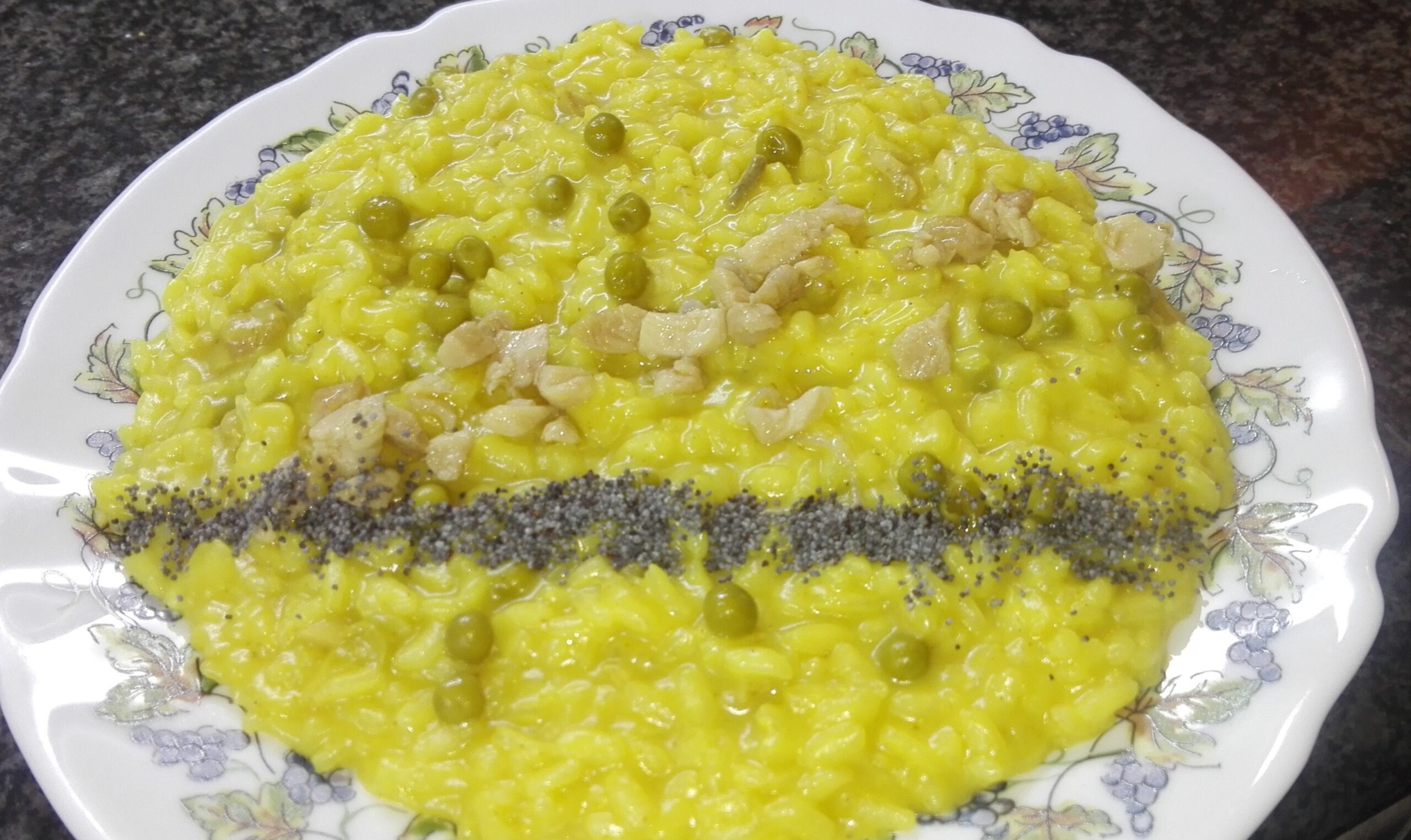 Il risotto allo zafferano è un classico della cucina tradizionale milanese. Sono molte le varianti presenti, che si leggono sui siti di cucina. Ogni ristorante ogni massaia, ha la sua ricetta personale, con le varianti più impensabili. Oggi voglio presentarvi la mia variante, ho preparato un risotto alla zafferano, con l’aggiunta di piselli, pollo e per finire il tutto guarnito con semi di papavero. Di seguito vi lascio la ricetta, in modo che potete preparare anche voi questo sfizioso e inusuale primo piatto.