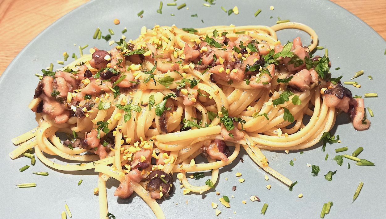 Tagliate i tentacoli del polpo a rondelle, conservate qualche rondella e la parte finale per guarnire il piatto. A cottura quasi ultimata , aggiungete il polpo e continuate la cottura.