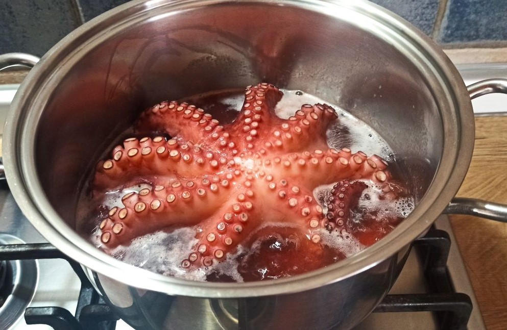 Per preparare il risotto al brodo di polpo, iniziate a lessare il polpo.