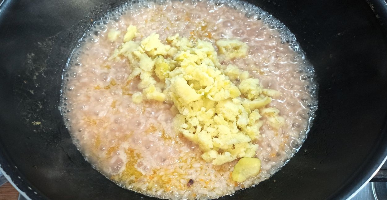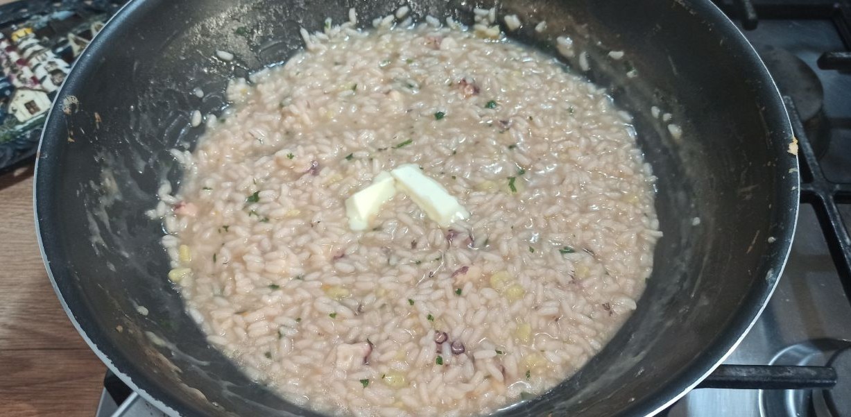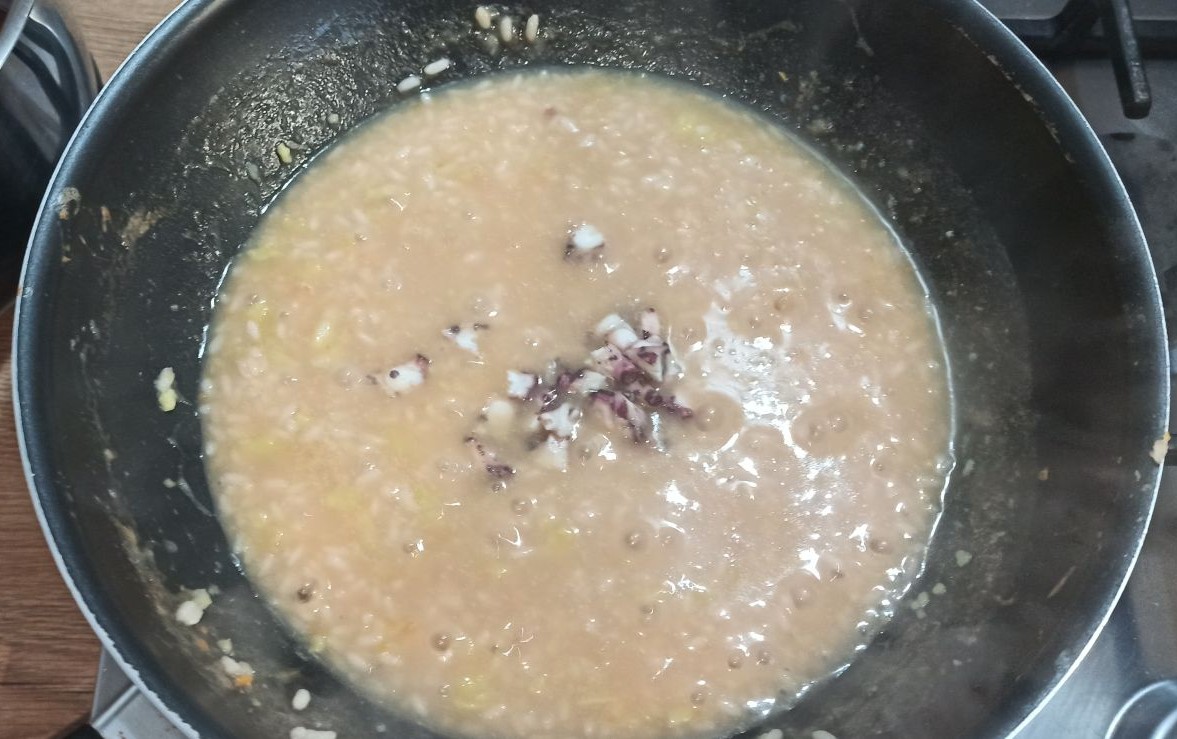 Il tempo di cottura dipenderà dalla grandezza del polpo. Per il risotto basteranno un paio di tentacoli, il resto farete un’ottima insalata di polpo. Lessate anche la patata, pelatela e schiacciatela.