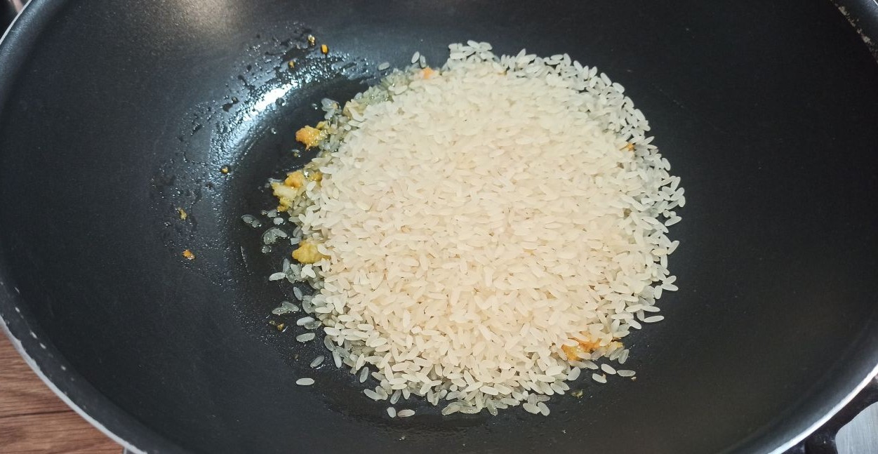 In una capiente padella, mettete un giro d’olio evo, aggiungete le verdure tritate, fate sfrigolare per un minuto. Aggiungete il riso, appena inizia a tostare,