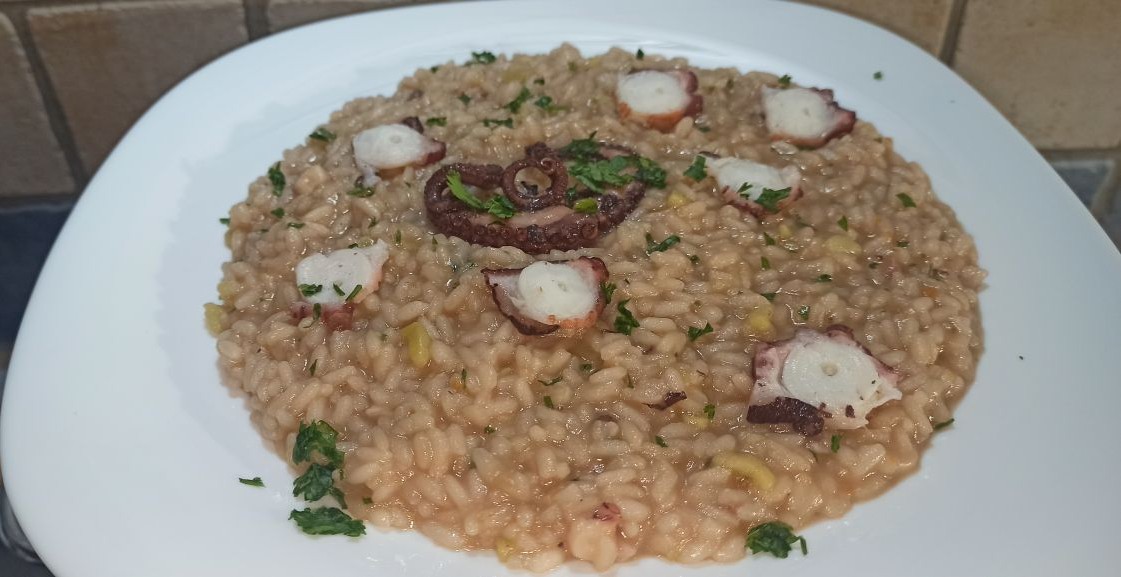 Impiattate, completate il piatto aggiungendo il polpo, ed un trito di prezzemolo. IL vostro risotto al brodo di polpo, è pronto per essere servito e gustato.