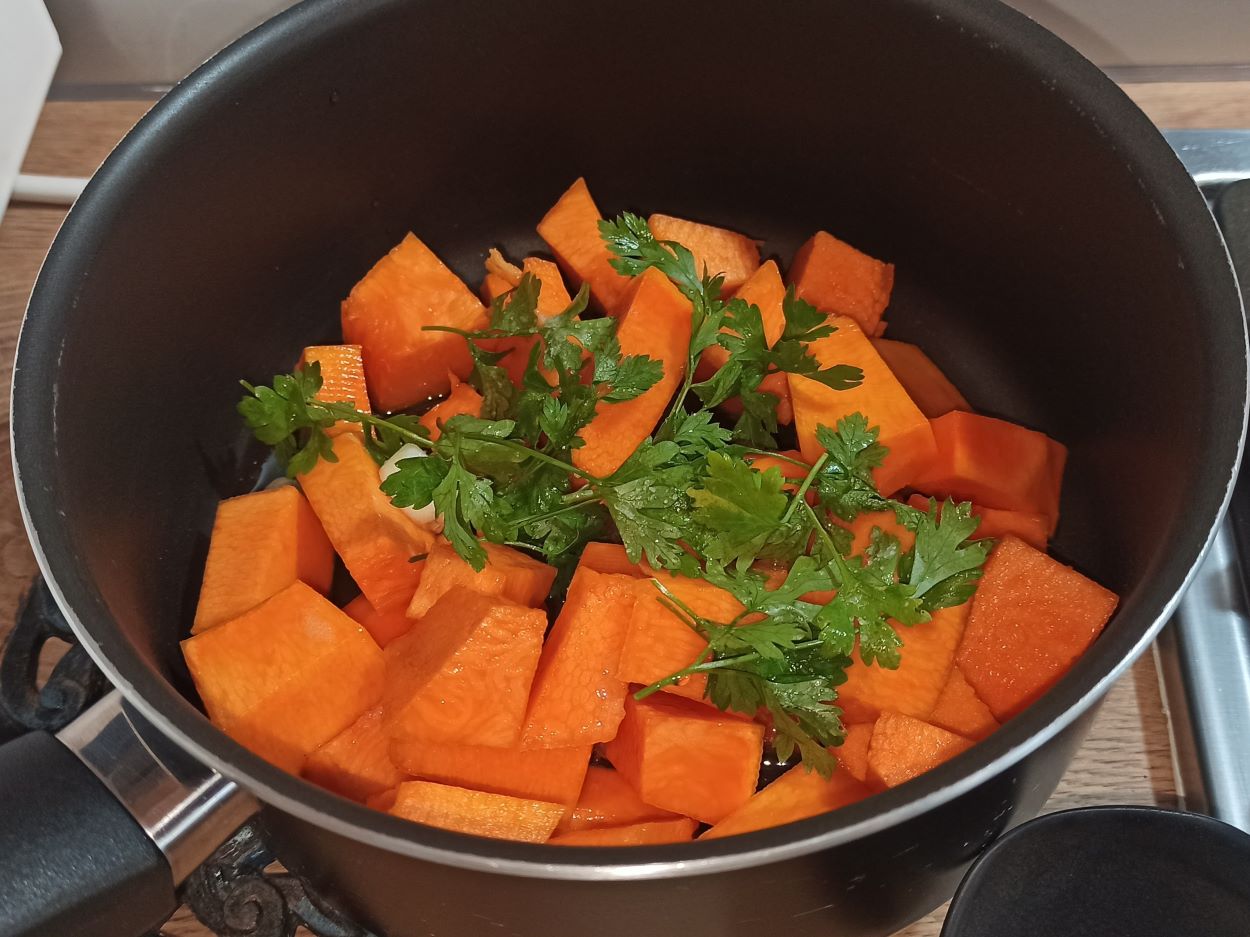 In un pentolino mettete un filo d’olio evo, lo spicchio d’aglio, il prezzemolo e la zucca.