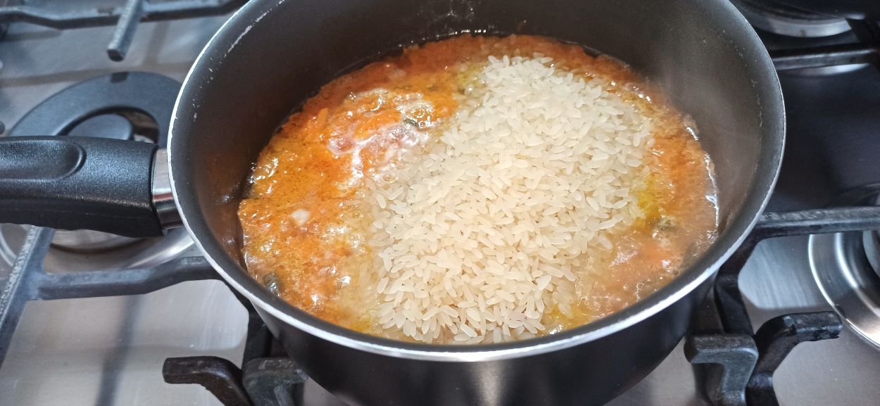 Fatela cuocere a fiamma dolce, con il pentolino semicoperto. Appena sarà cotta, eliminate l’aglio, aggiungete un poco di brodo vegetale, amalgamate il tutto, se occorre regolate di sale. Aggiungete il riso, iniziate la cottura, aggiungendo il brodo vegetale a bisogno.