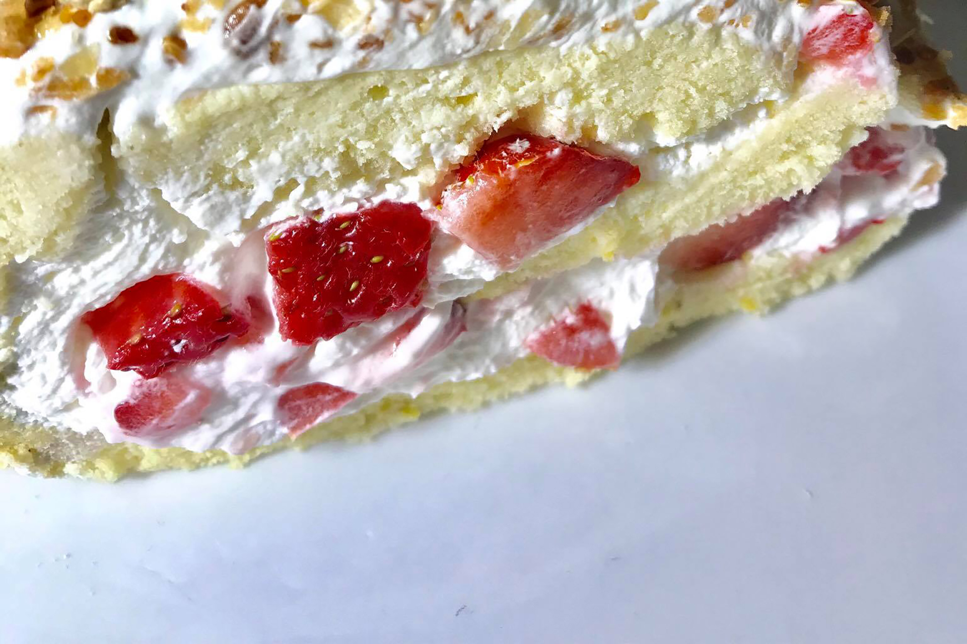 Intanto prepariamo la bagna: fate bollire tutti gli ingredienti per la bagna, cospargete il Pan di Spagna con la bagna. Aggiungete uno strato di crema di mascarpone e pezzi di fragole. Per ultimo, arrotolatelo e spolverizzatelo con lo zucchero a velo.