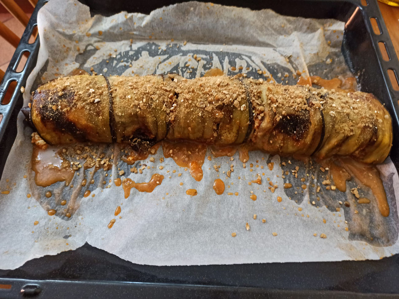 Utilizzando la carta forno, arrotolate il tutto con cura, compattando bene il rotolo mentre lo stringete. Cospargete il rotolo con abbondante pangrattato per ottenere una crosticina croccante durante la cottura. Avvolgete il rotolo nella carta forno e lasciatelo riposare in frigorifero per un’ora. Trascorso il tempo di riposo, prelevate il rotolo dal frigorifero, rimuovete delicatamente la carta forno e trasferitelo su una placca rivestita di carta forno. Cuocete in forno preriscaldato a 180°C per circa 20 minuti. Una volta cotto, lasciate intiepidire per facilitare il taglio. Il vostro rotolo di melanzane al forno è pronto. Per una versione più leggere potete anche cuocere le melanzane in forno disposte in file ordinate su una teglia e poi cosparse di sale e olio e infine condite come in precedenza. Sarà ugualmente buonissimo. Buon appetito!